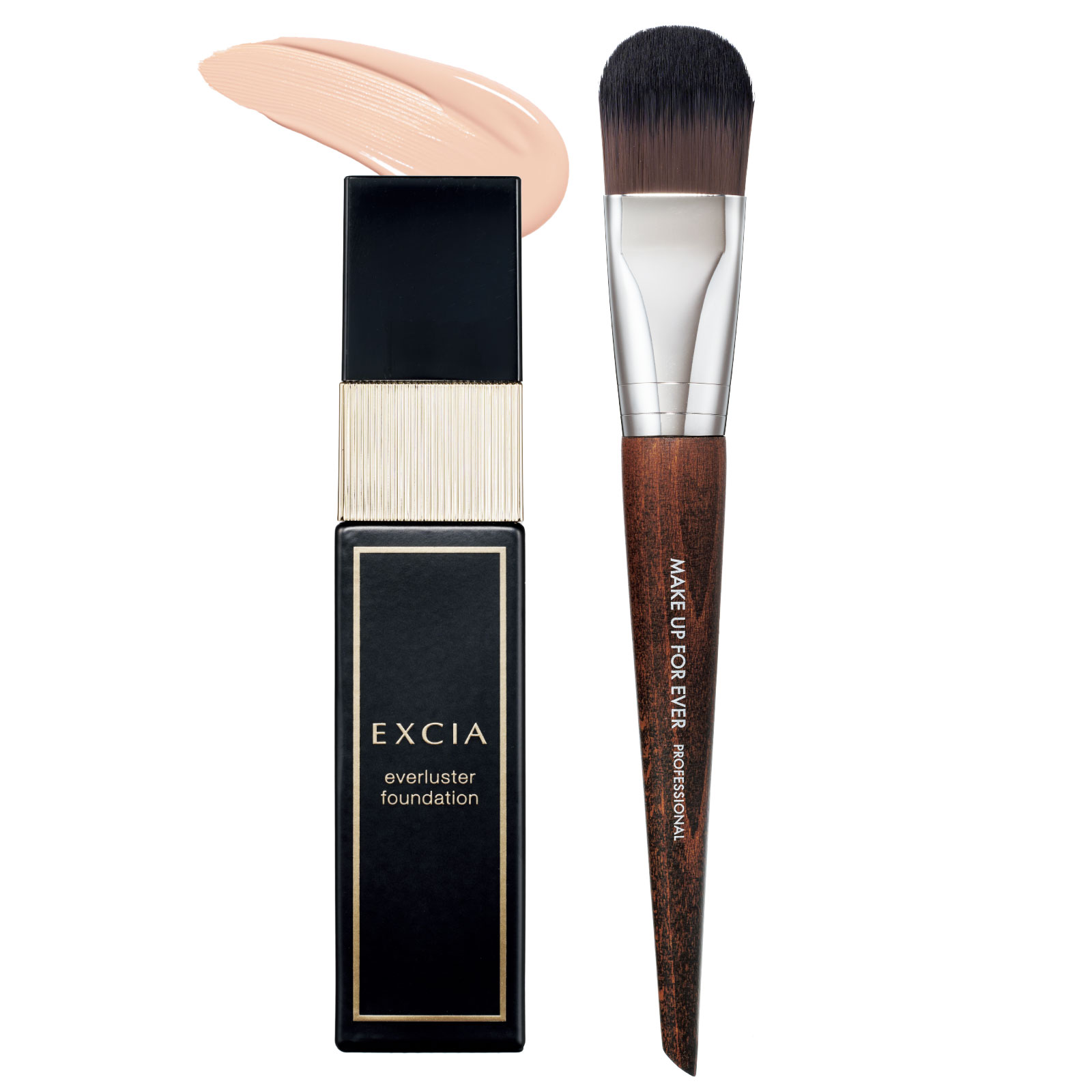 均一に肌にのせられる平筆がおすすめ。薄膜にすることでシワが目立ちにくいメリットも。左から:エクシア エバーラスター ファンデーション SPF50+・PA ++++ ¥16,500(アルビオン)ファンデーションブラシ ミディアム 106 ¥6,050(メイクアップフォーエバー)
