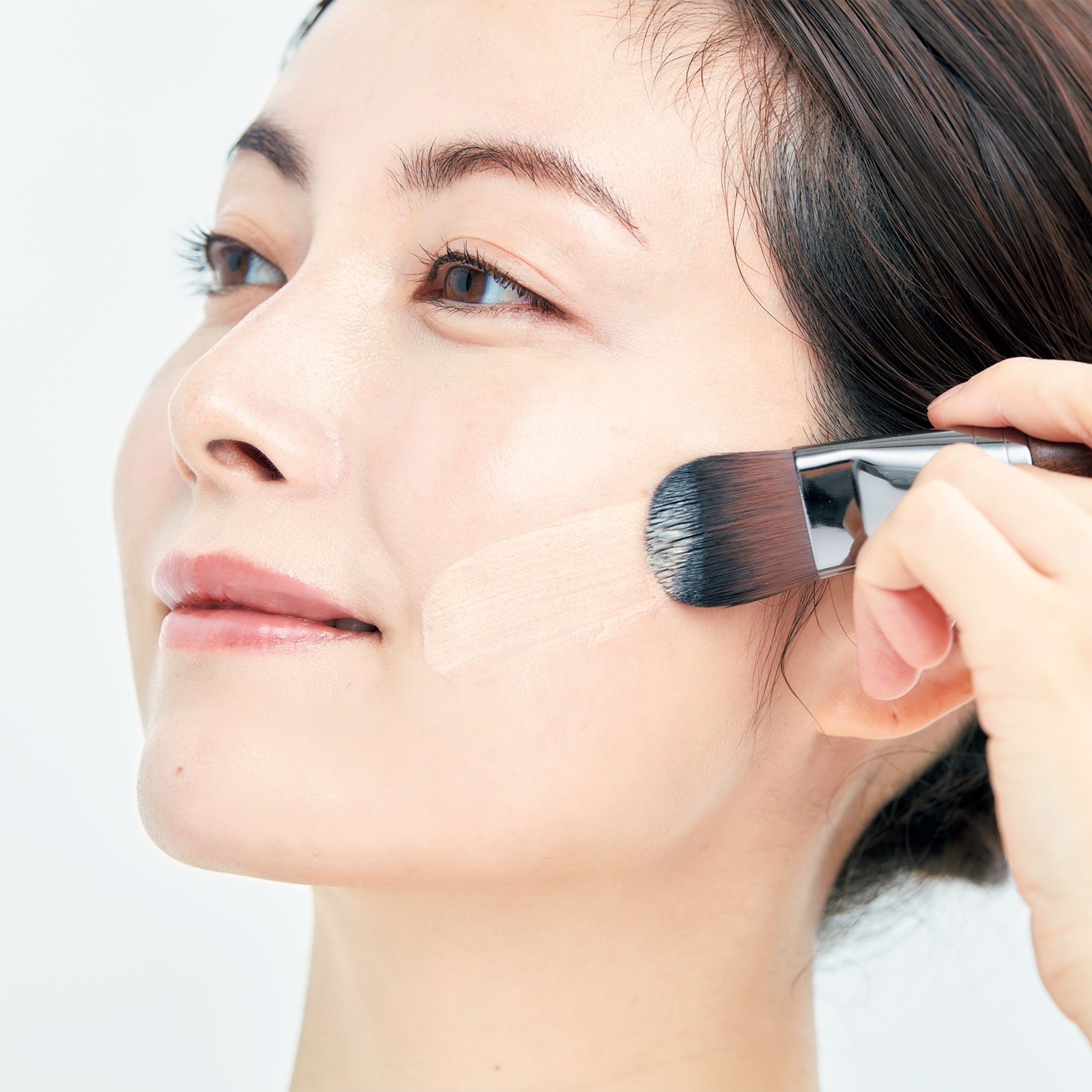 肌あたりのよい平筆で塗ることで毛穴などの凹凸も滑らかにカバー。ファンデを引き上げるように下から上へ塗布することで立体感のある仕上がりに。