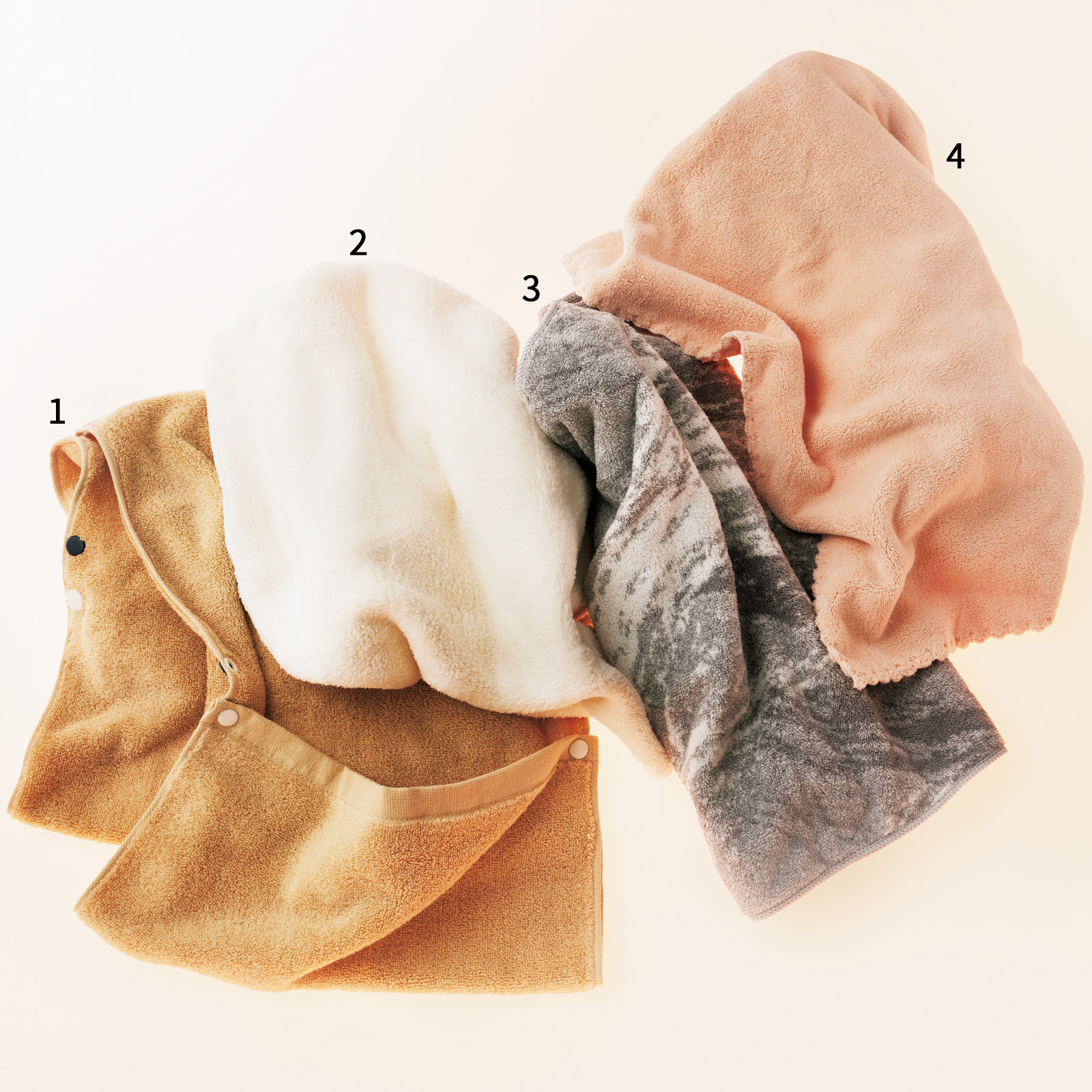 吸水性の高い特殊な糸を使用、綿100%ながら髪の水分を瞬時に吸収できる今治タオル素材。長い髪は毛先をポケットに入れて頭巾のようにかぶってブローすると素早く乾かせる。¥3,080(オリム)