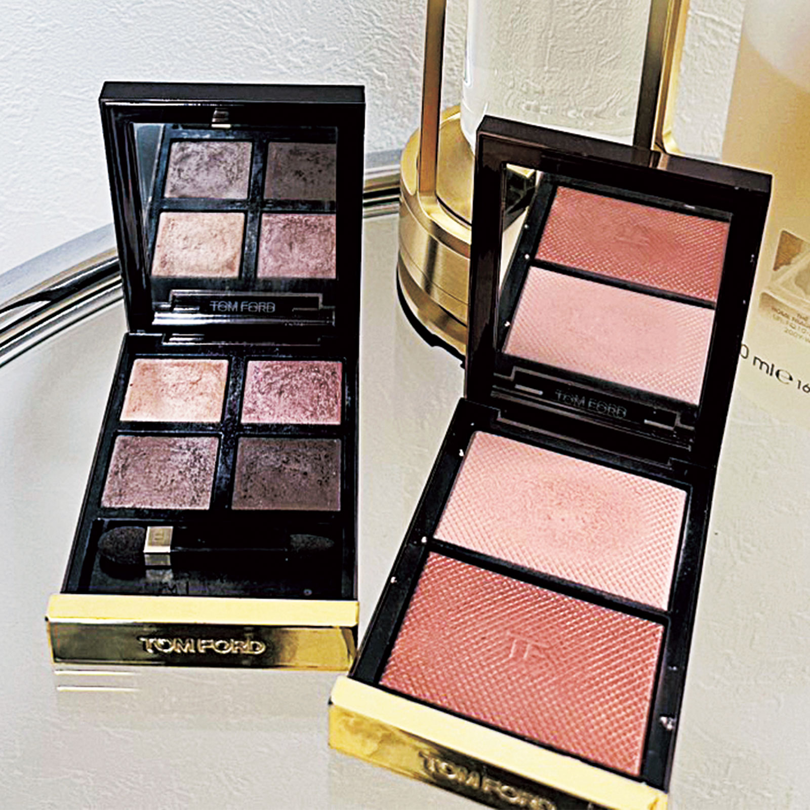 トム フォード アイ カラー クォ-ド3Aは日常使いしやすいグレージュカラーにひとめぼれ。シェイド アンド イルミネイト ハイライティング デュオ P1で粉っぽさのない繊細なツヤと立体感を。
