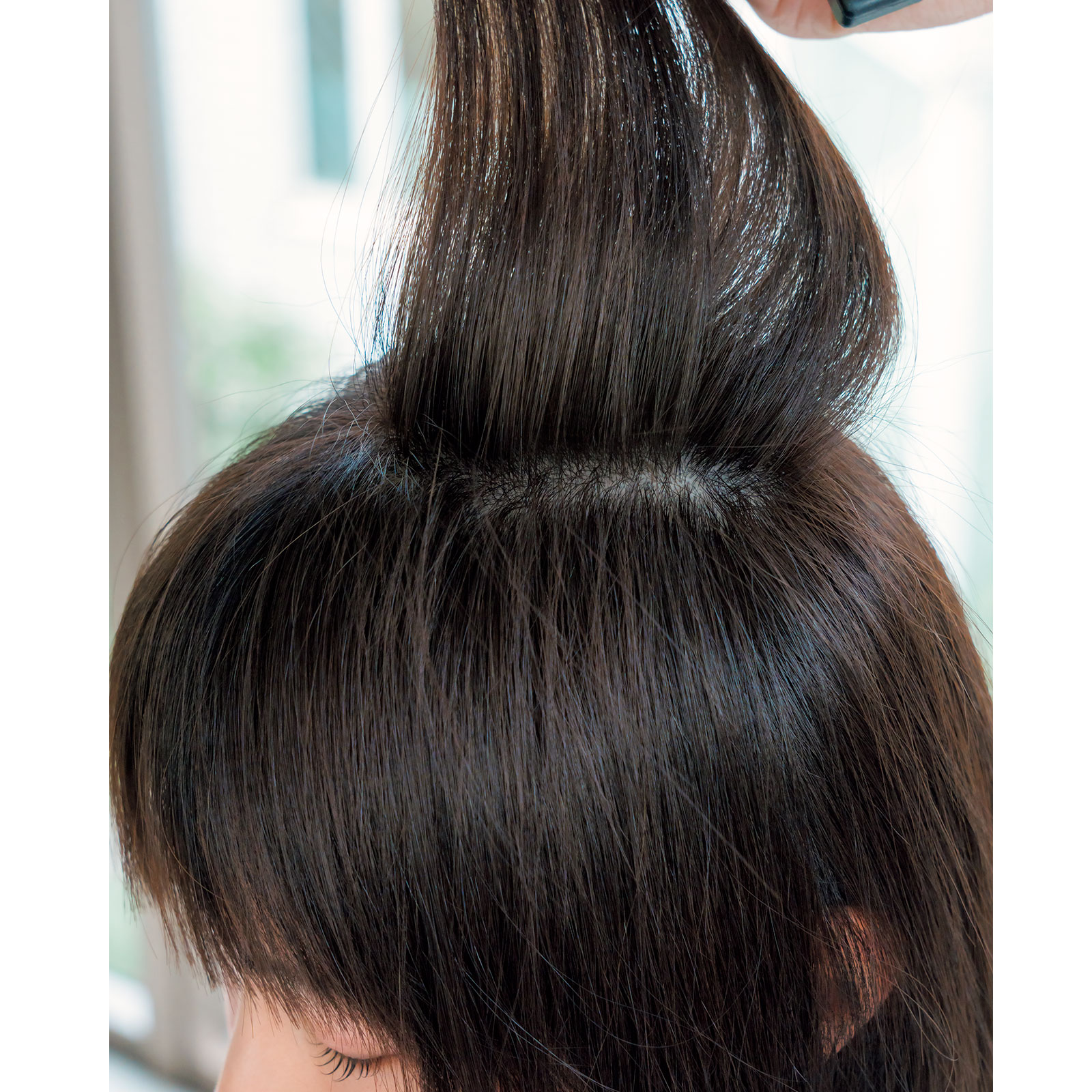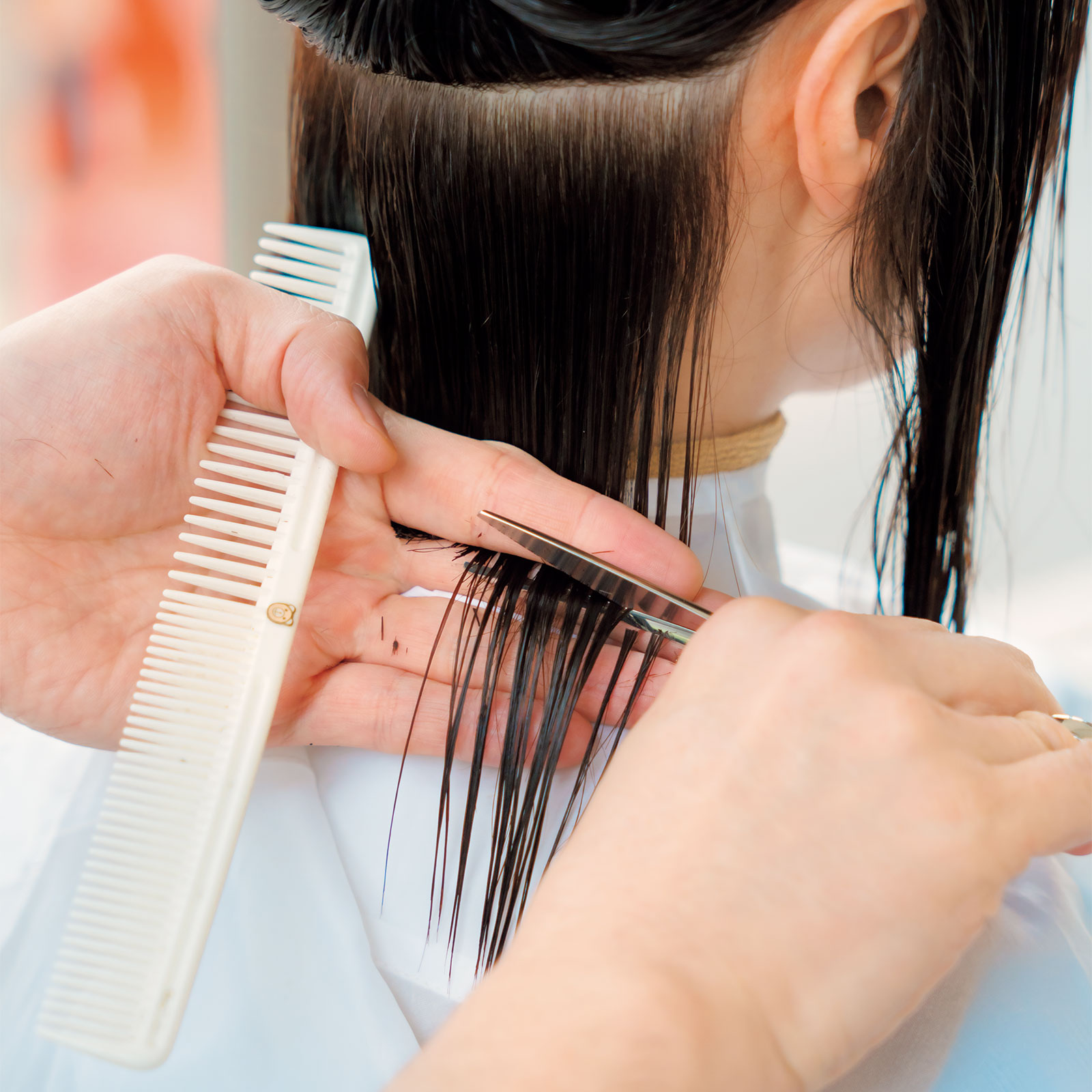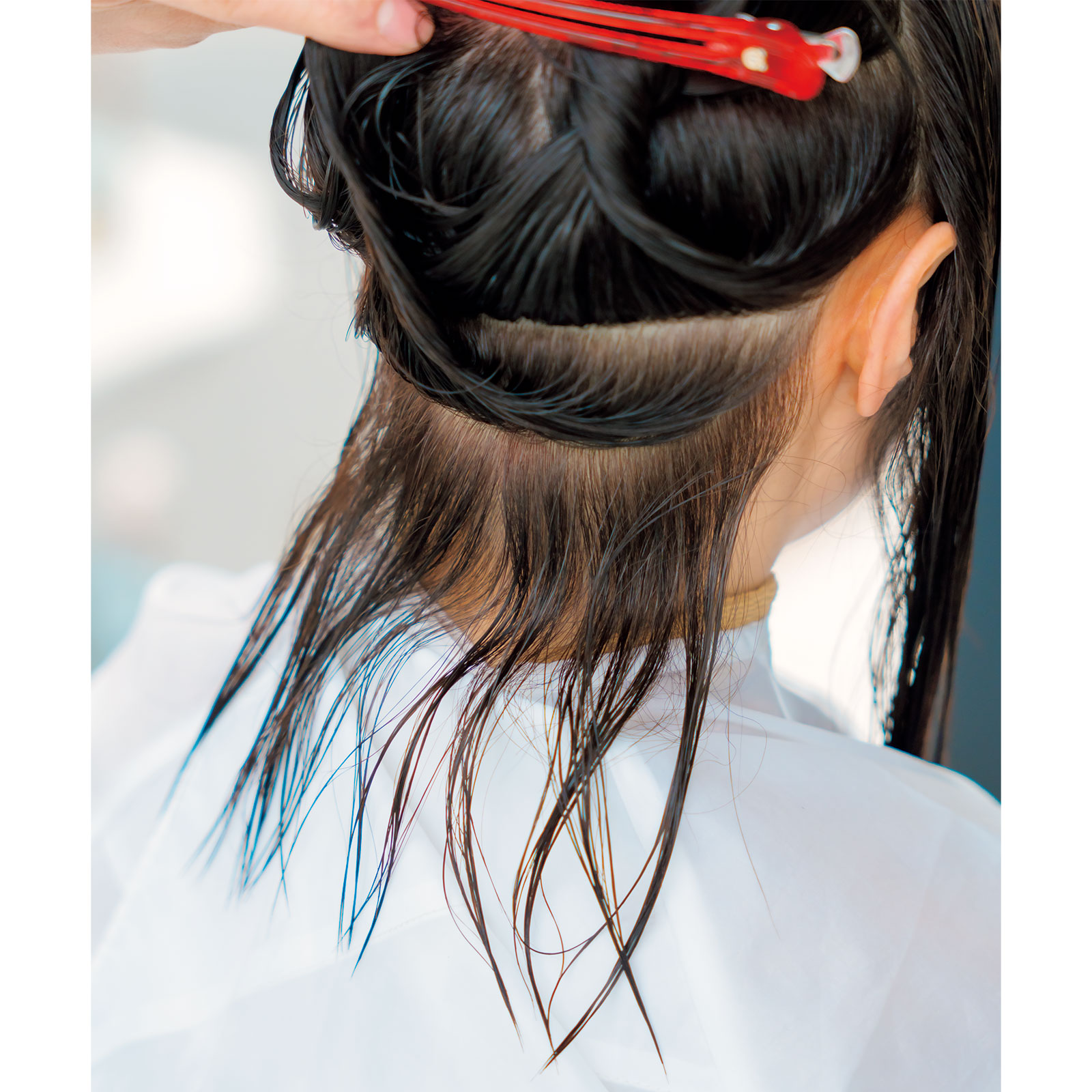 クセのある衿足は内側を短めにカット。外側の髪をやや長めにし上にかぶせることで、衿足がタイトにおさまり、まとまりやすくなります。
