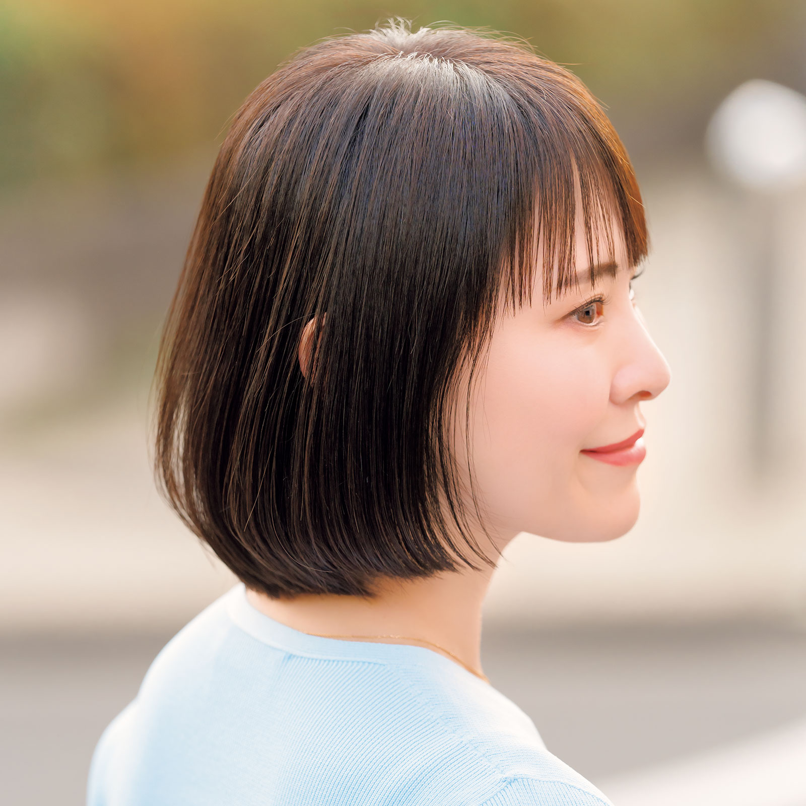 丸みのあるシルエットと透け感のある短めバングが若見えするボブスタイル。毛流れがキレイに見えるのでベージュブラウンが引き立ちます。