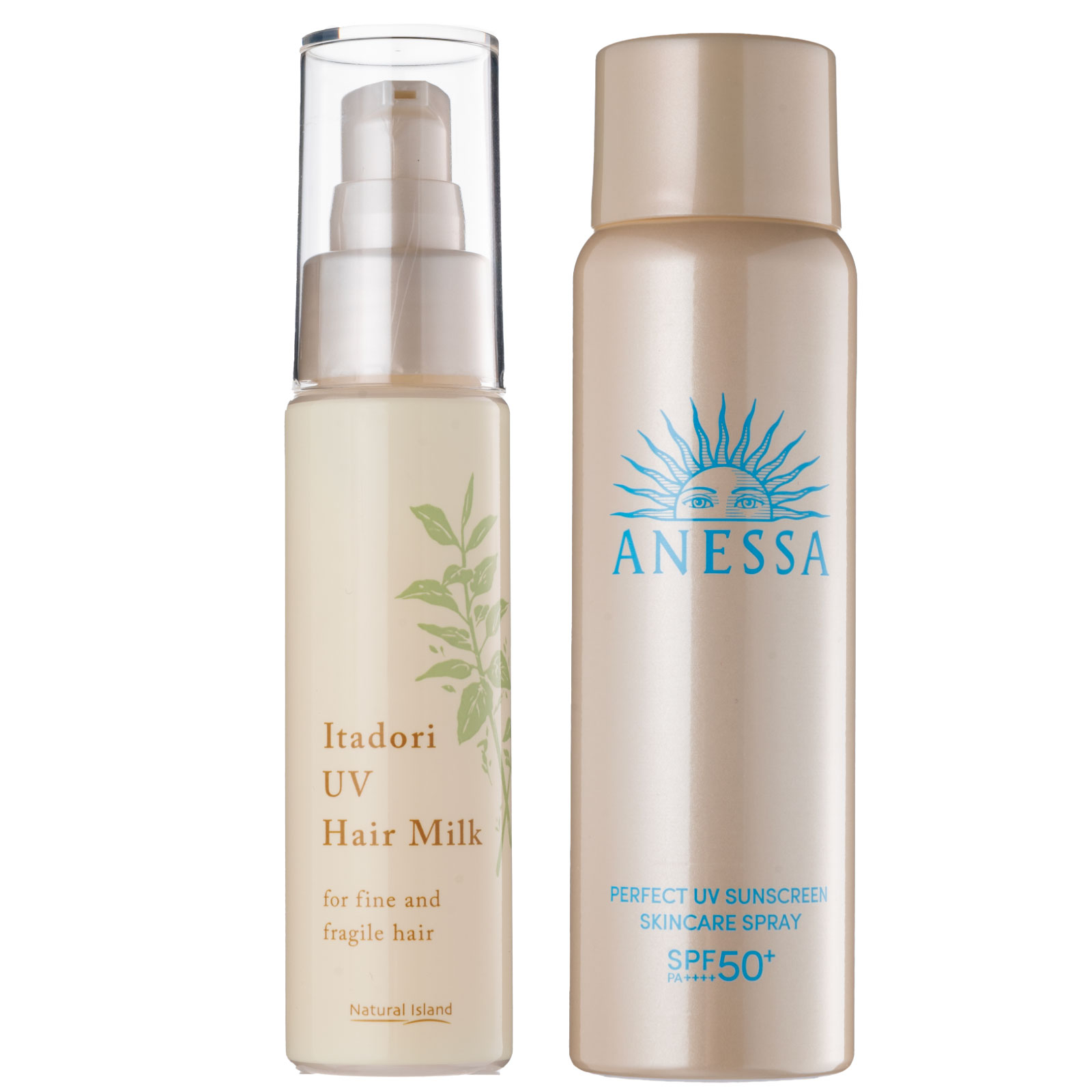 髪のエイジングにつながる紫外線ダメージは徹底カット。頭皮にはアネッサのUVカットスプレー、髪にはイタドリUVヘアミルクで完璧。