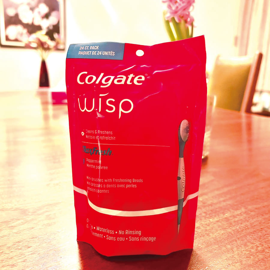 ハンドル部分のソフトピックがフロス代わりにもなるコルゲートの使い捨てミニ歯ブラシ。水やすすぎも不要で、外出先で気軽に歯磨きができるので常に持ち歩いています。