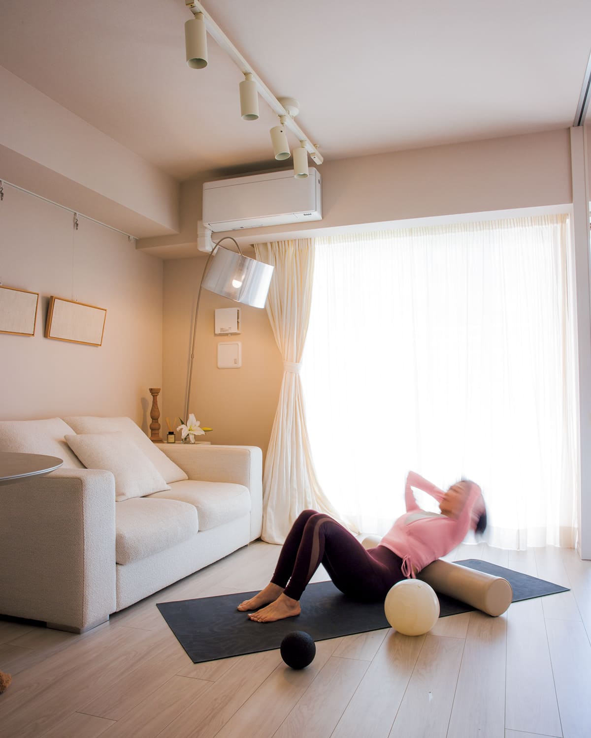 姿勢が悪いと顔のたるみや二重あごにつながります。そのため、ストレッチポールやギムニックボールなどを使って、胸椎の伸展などにつながるエクササイズを毎日継続して行っています。