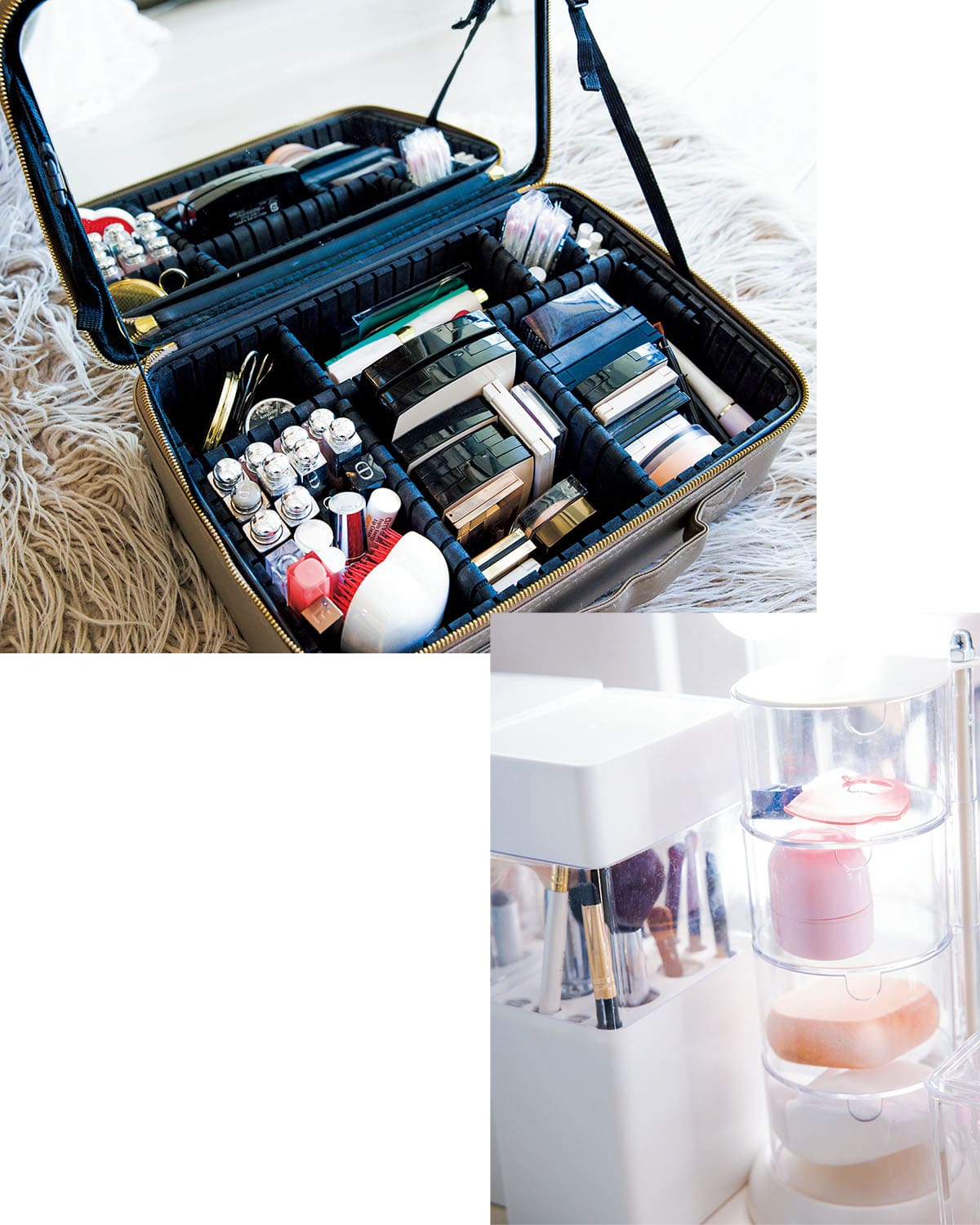 BEAUTMEのドレッサーは女優ミラーが映えます。すぐ汚れるメークブラシは、洗ってスタンドに収納するとよく乾き、パフも収納ケースに個別に入れて清潔に。ミラー付き、仕切り付きのメークボックスは、外で撮影する場合このまま持ち出せばどこでもヘアメークできて便利。