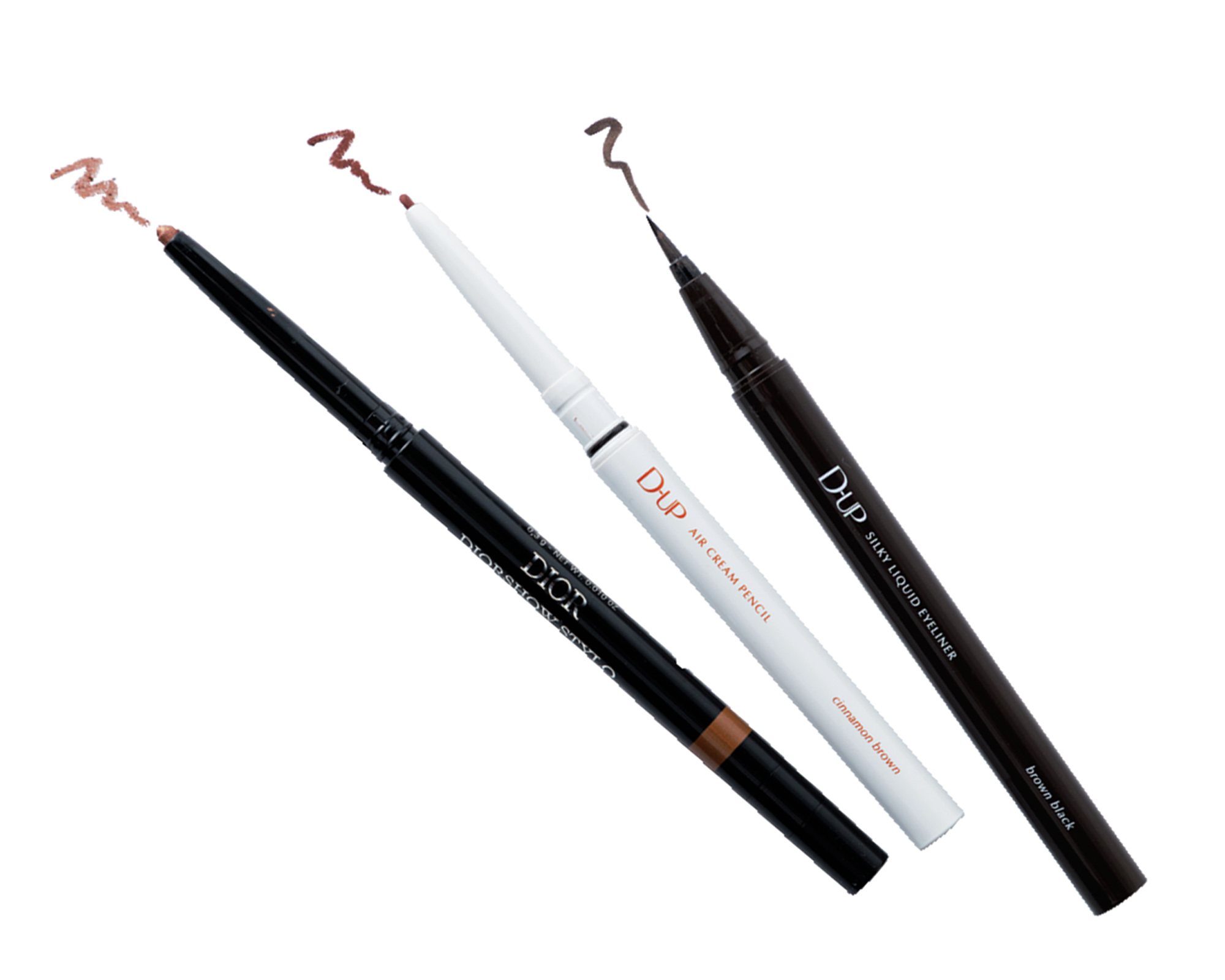 右から)D-UP のリキッドアイライナー(ブラウンブラック)で目を囲み、D-UP のペンシルアイライナー(シナモンブラウン)で目尻、DIOR のアイライナー(466)で下ラインを描いて目力アップ。
