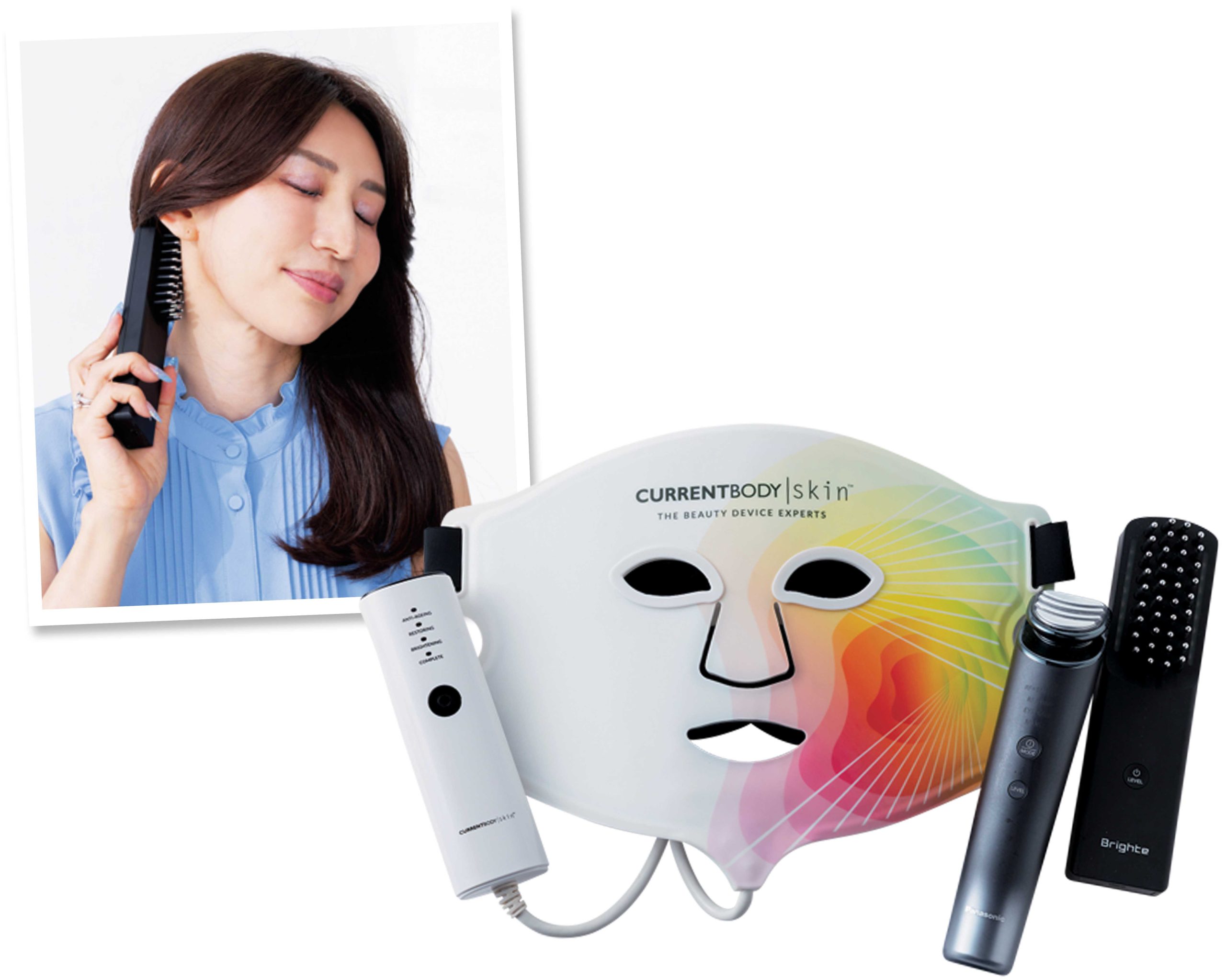 右から)朝はブライトのエレキブラシ、夜はパナソニックのバイタリフト、家事をしながらカレントボディ スキンのLED マスクを着用。