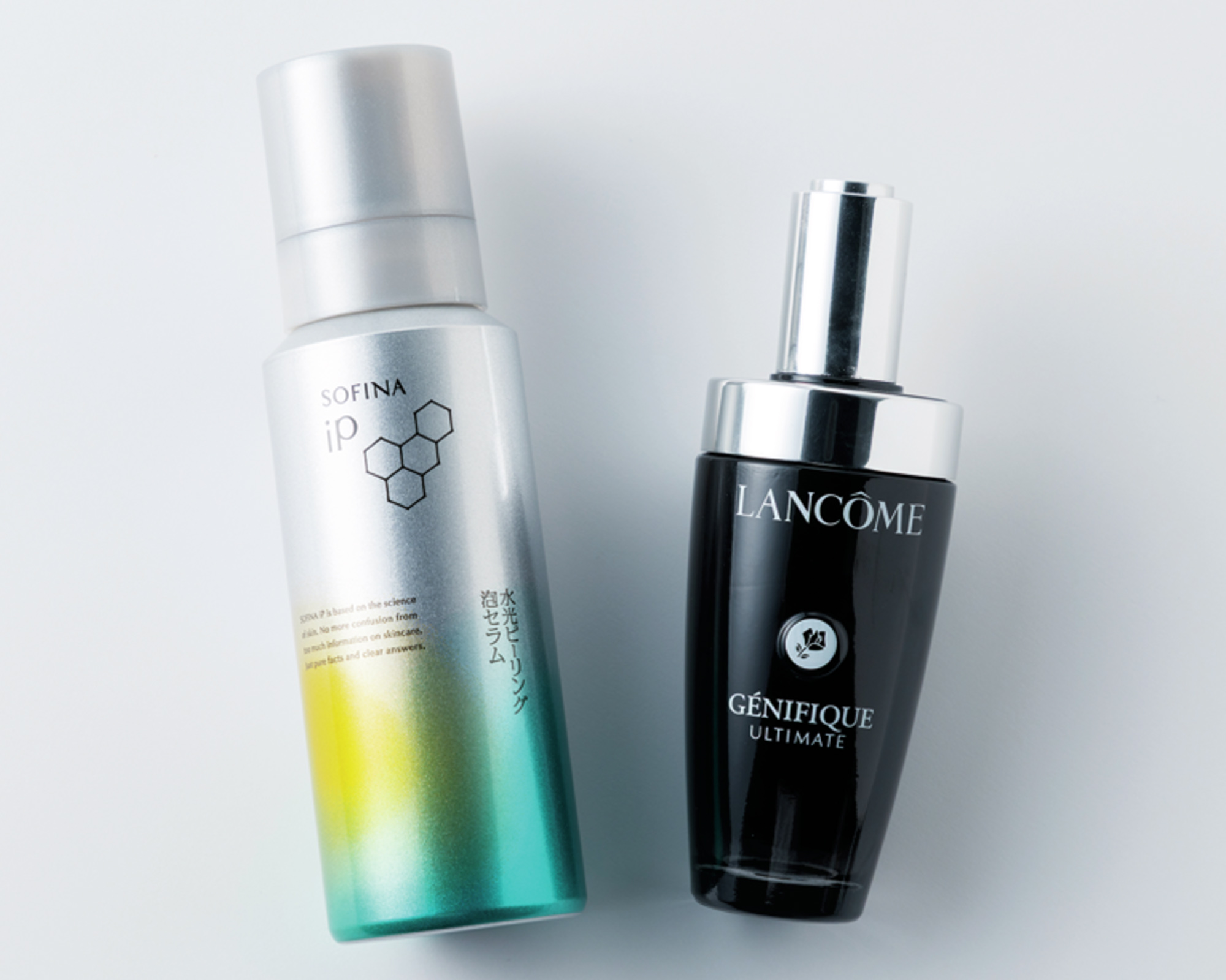 左から)ソフィーナのふきとり美容液で角質を除去し、ランコムジェニフィックの美容液で土台を整え、若々しい肌に。