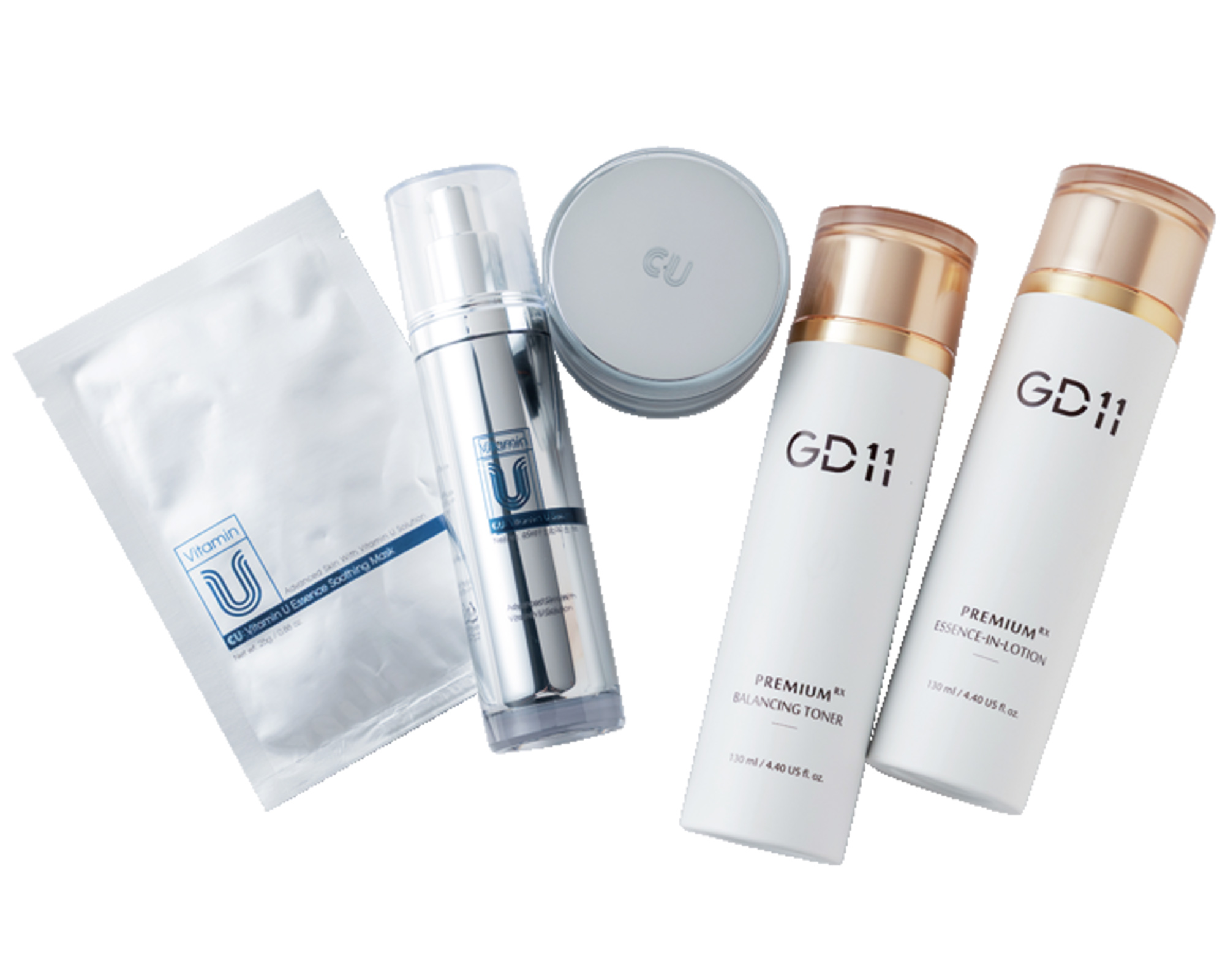 左)CUSKIN のシートマスクの後、(右端と隣)GD11のトナーとローションを重ね(左から2番目)ビタミンU セラムと(中)ビタミンU クリームを投入。小ジワが薄くなり、弾力もアップ。