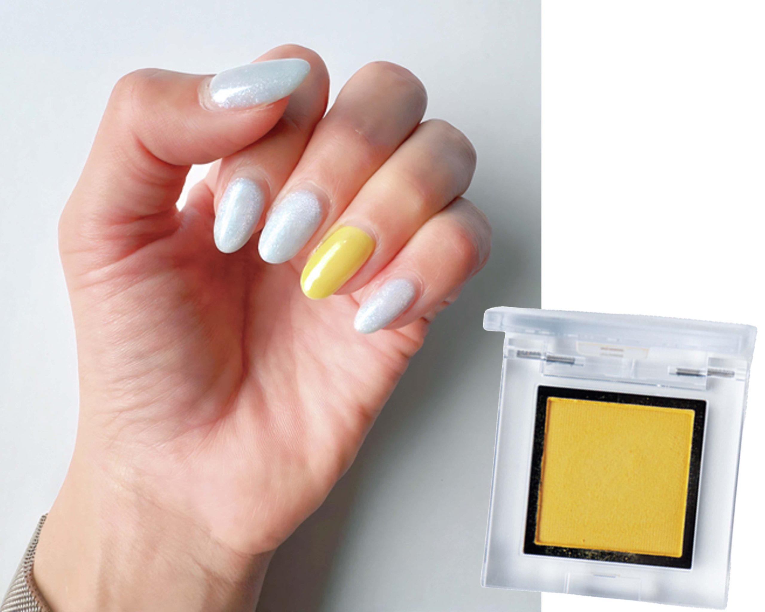 アディクションのアイシャドウ(022M)は肌馴染みがいいから浮かずに元気な印象に。ネイルも薬指だけイエローに♡