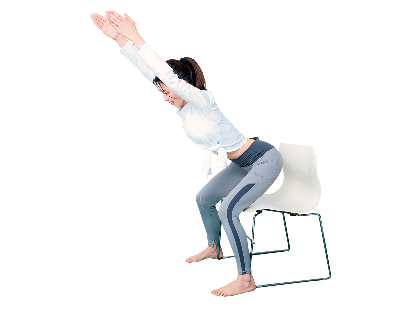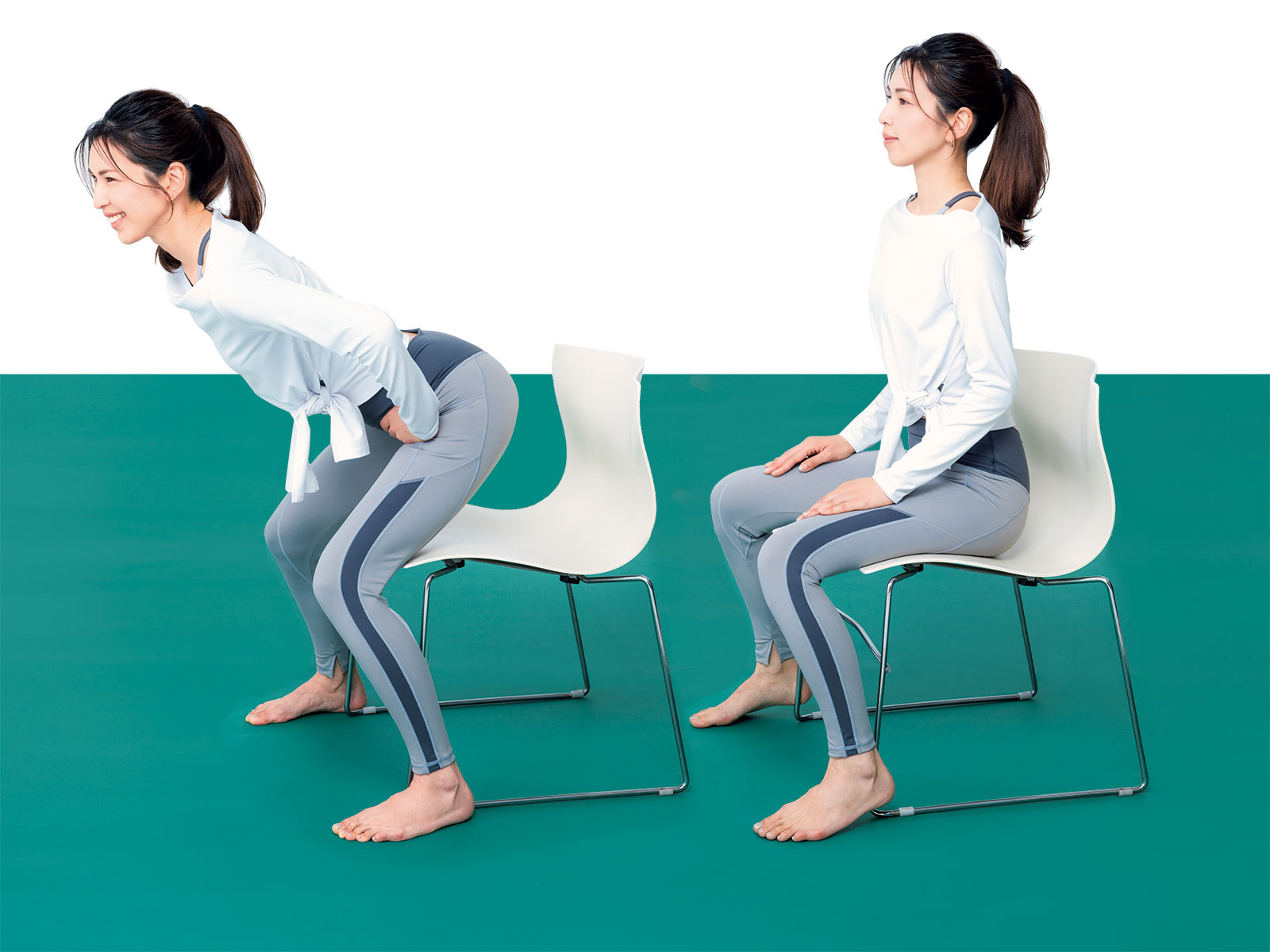 背筋を伸ばし椅子に浅く腰かけ、かかとが膝より少し手前にくるようにセット。椅子から立ち上がる日常の動作の“ながらトレ”で太ももに刺激を。