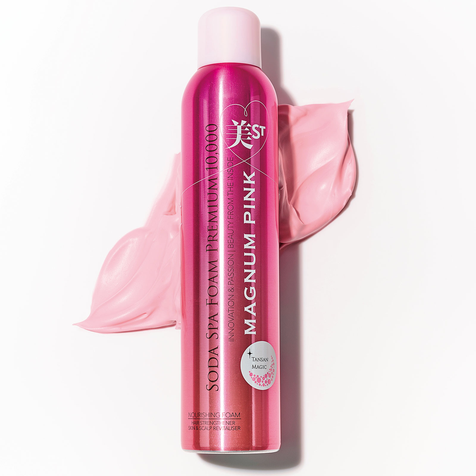 10,000ppmの高濃度炭酸を閉じ込めた炭酸パック。クリーミーな泡がなめらかにのびて密着。じんわりと温かくなって、洗い流してすぐに血色の違いを実感。ソーダスパフォームプレミアム 10,000 マグナムピンク200g¥4,950(東洋炭酸研究所)