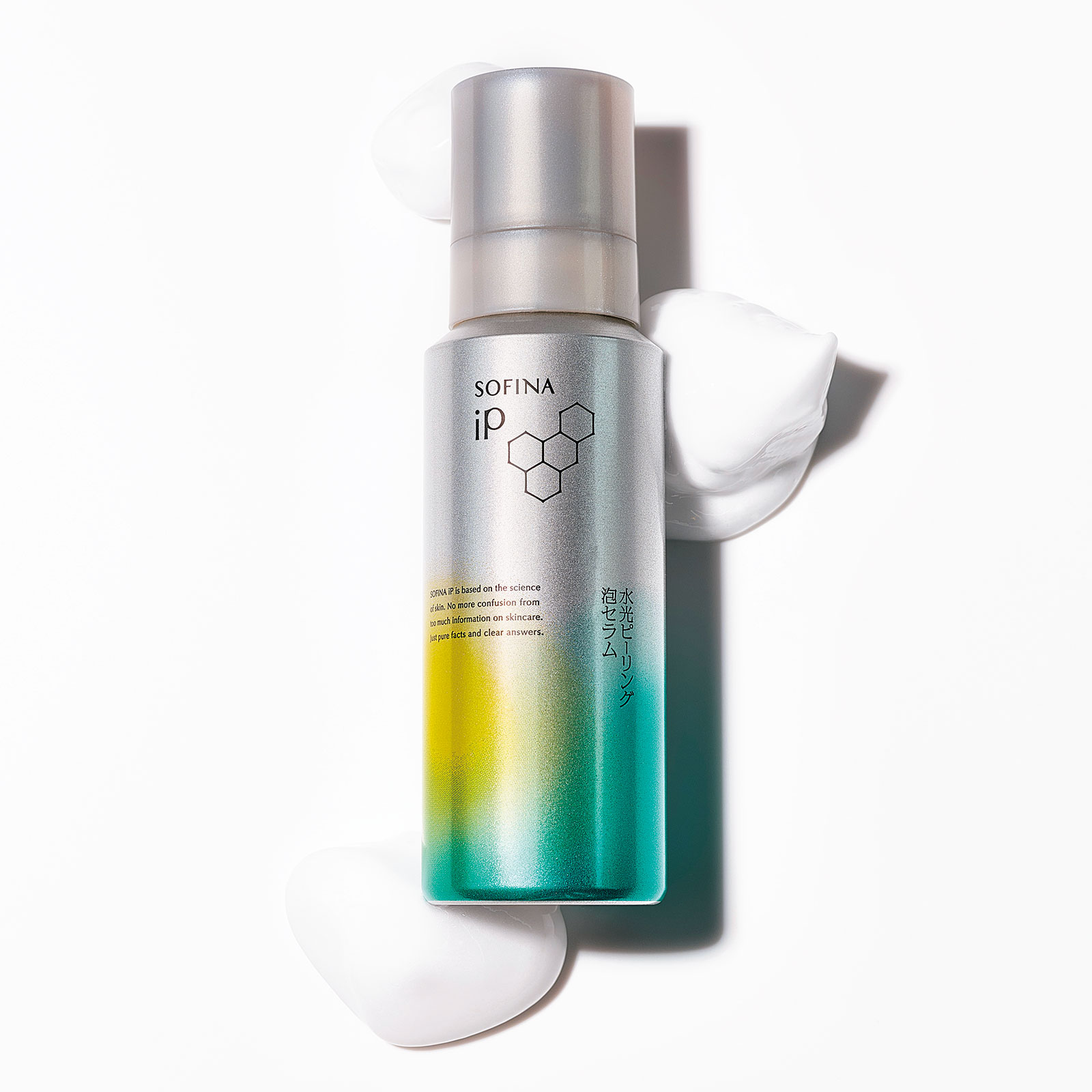 肌の上でとろけて密着する炭酸泡の拭き取りピーリング美容液。炭酸と角層クリア成分のWの角質ケア効果で肌をやわらげ、古い角質を除去。さらに角層細胞まで潤わせ、透明感のある艶やかな肌に。ソフィーナiP 水光ピーリング泡セラム 120g¥4,290〈編集部調べ〉(花王)