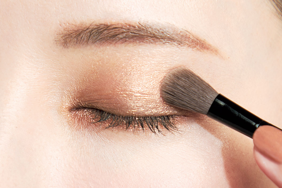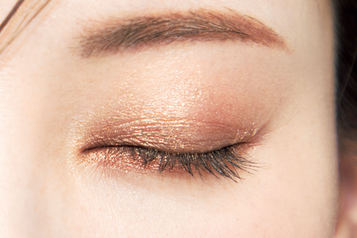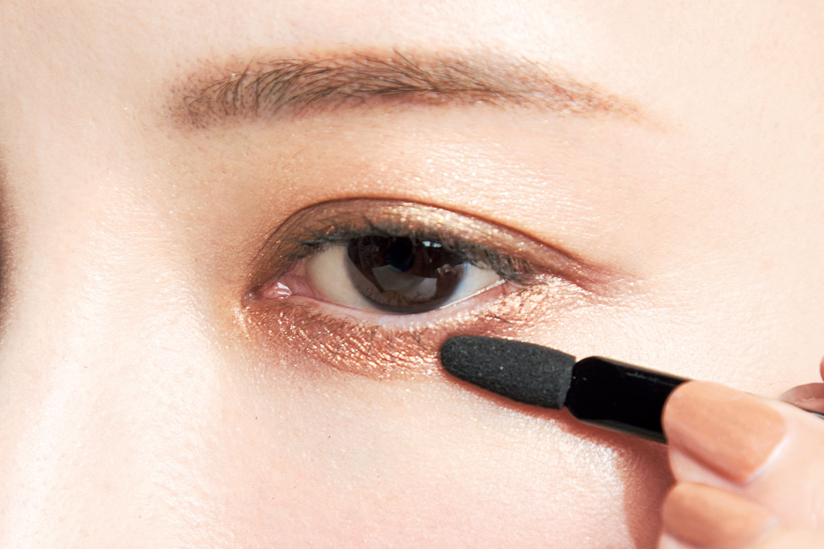 下まぶたは左下を細チップに取り、目頭から目尻までに塗布。血色感と煌めきで潤んだような瞳に。