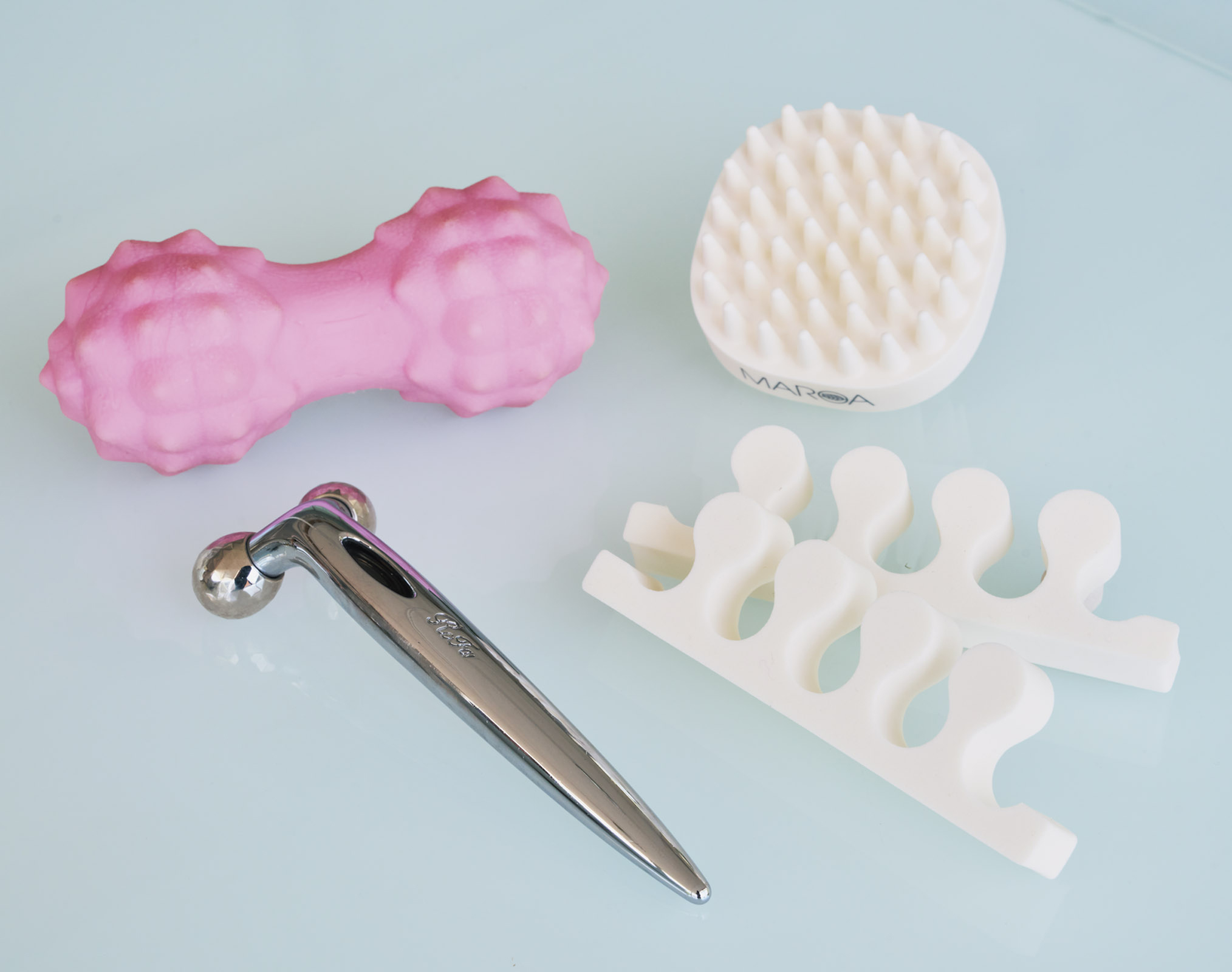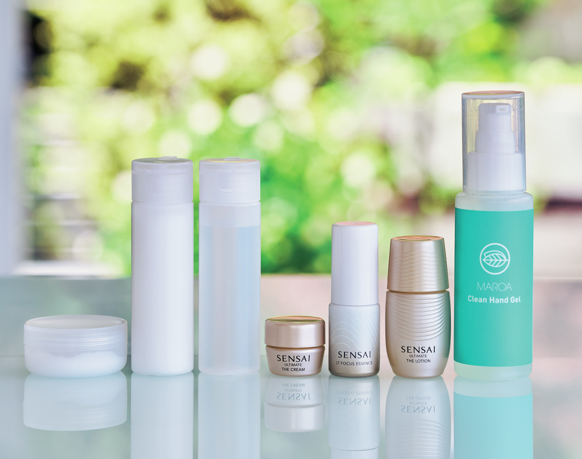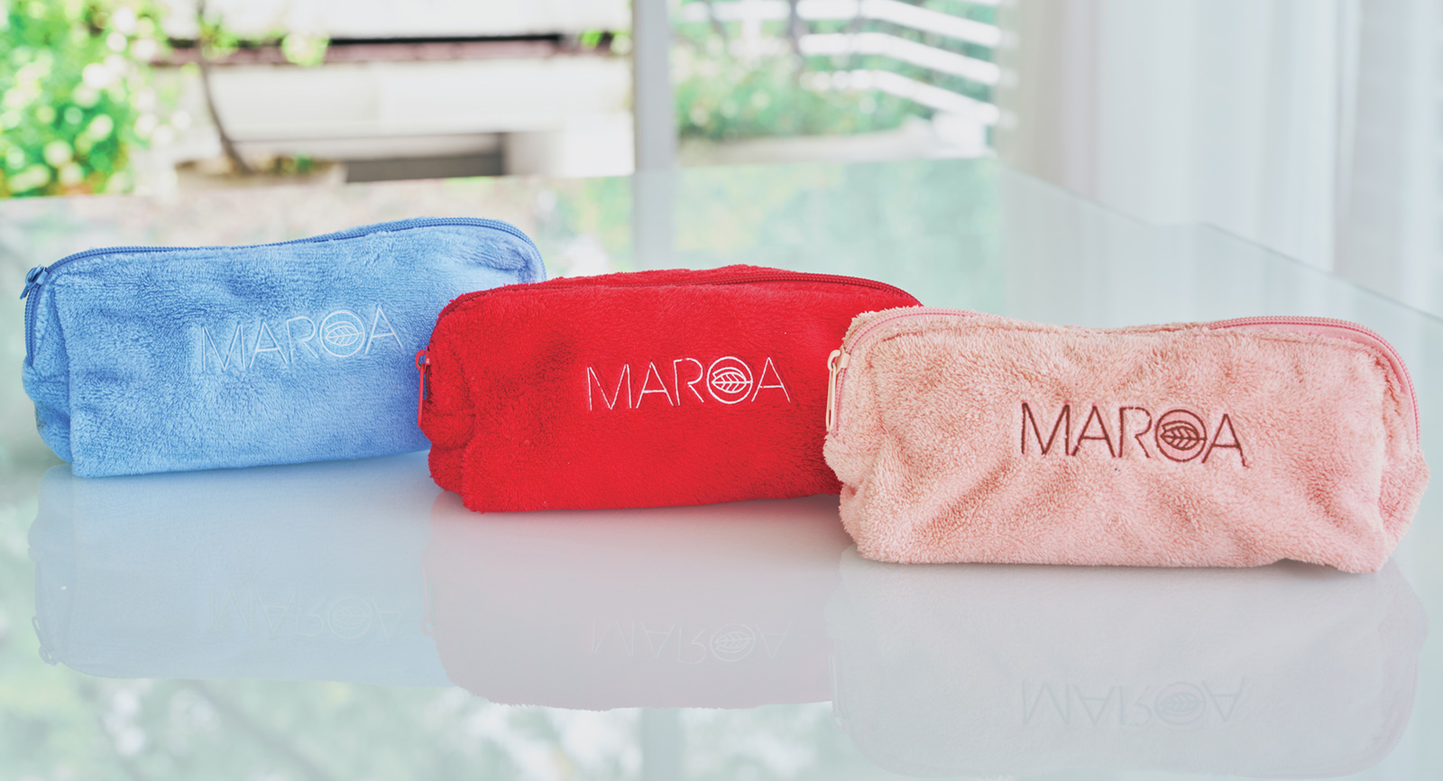 海外は数週間単位で滞在することも多いので、カテゴリー別にコスメをパッキング。パイル地のポーチは私が立ち上げたスパブランド、MAROAのもの。