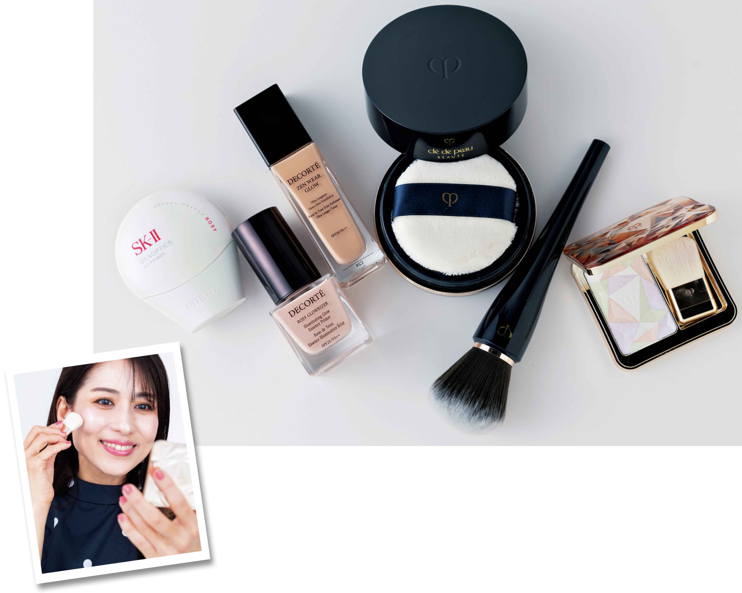左から)SK-ⅡのCC プライマー→デコルテの下地→デコルテのファンデを薄く伸ばしてツヤ感ベースを作り、クレポのパウダーを全体的にふわっとのせてから頰や鼻筋にクレポのハイライトを重ねて輝きをプラス。