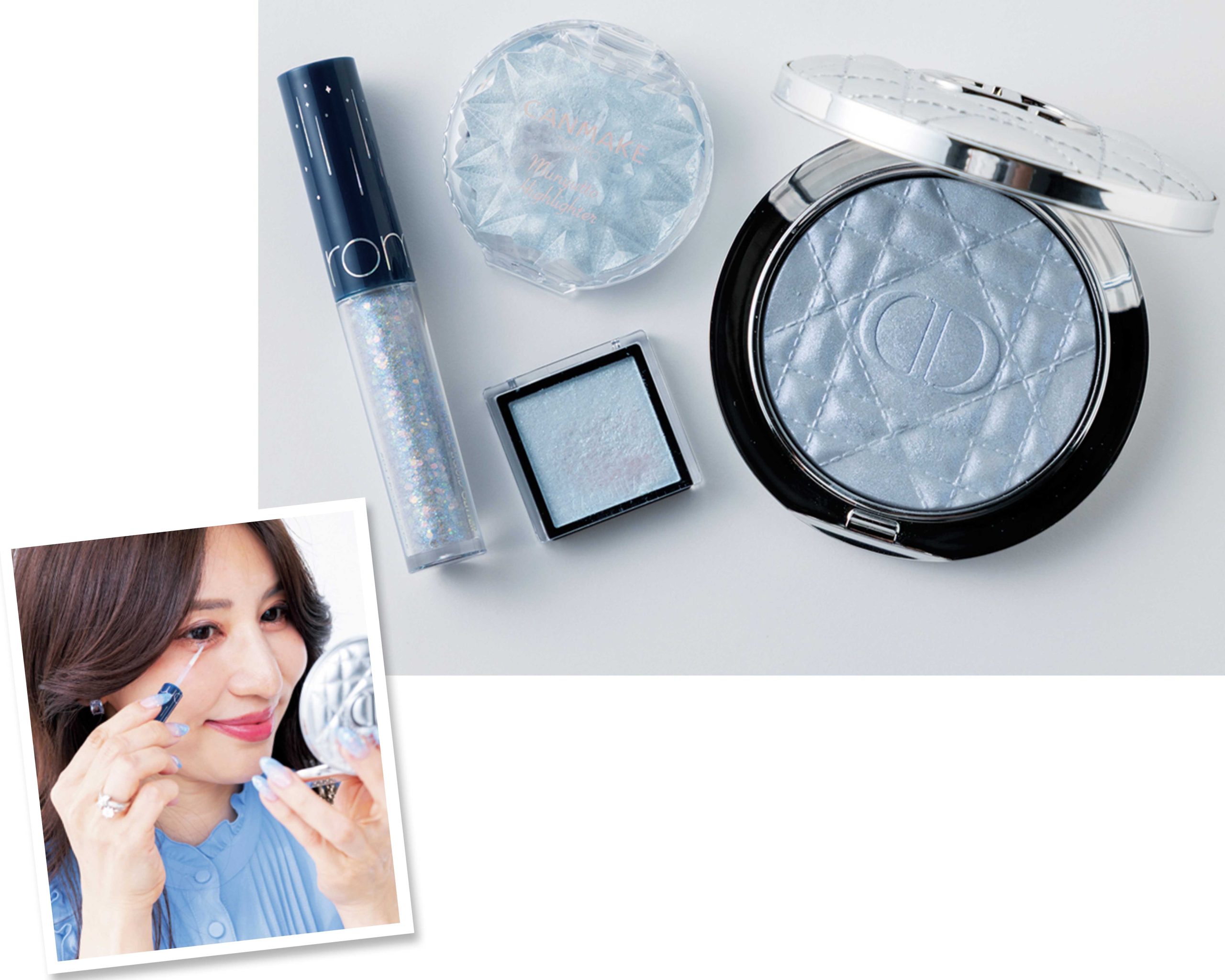 右から)DIOR ルミナイザー(05)を鼻筋と目頭、マキアージュのアイシャドウ(BL174)はアイホール全体、キャンメイクのハイライト(04)は額、ロムアンドのグリッター(04)は黒目の下。