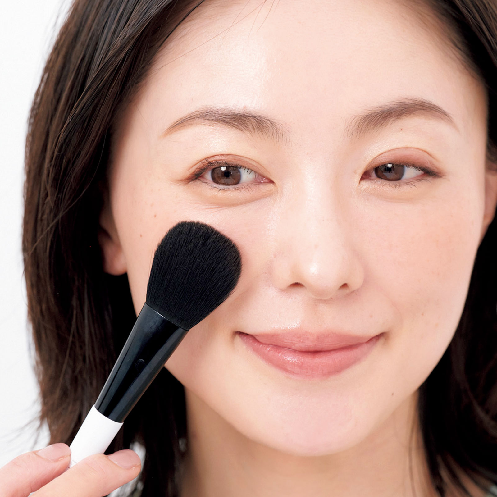 チークを含ませたブラシをティッシュの上でクルクルし、筆の中によくなじませてからオン。くすみやすい黒目下から、押しつけず軽くなぞるようにオン。頰がほんわり、元気な血色に!