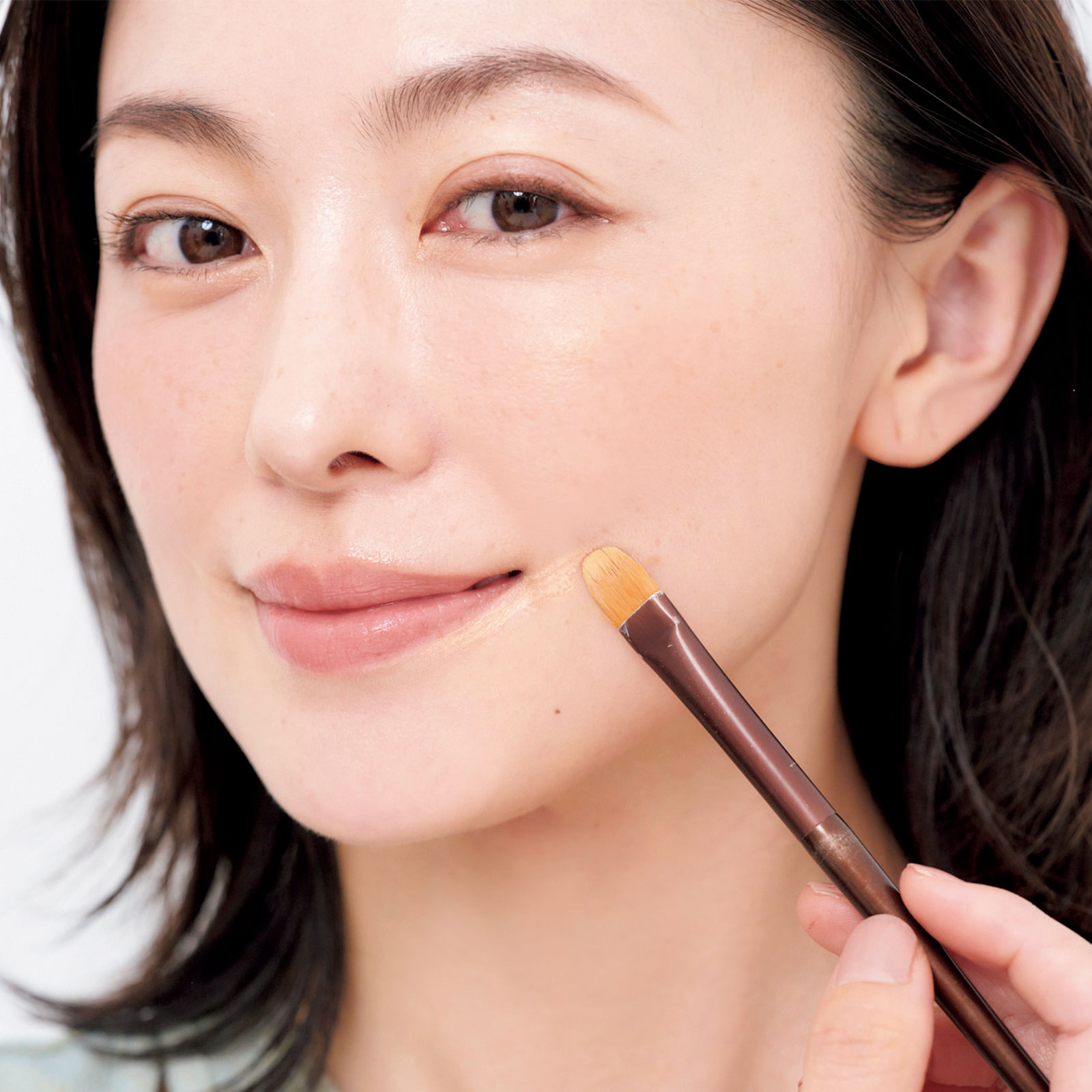 くすみやすい口まわり、口角には再度ファンデーションを筆で塗布。唇に沿うように上方向へ入れると、影が消えて口角までキュッと上がった印象になります。
