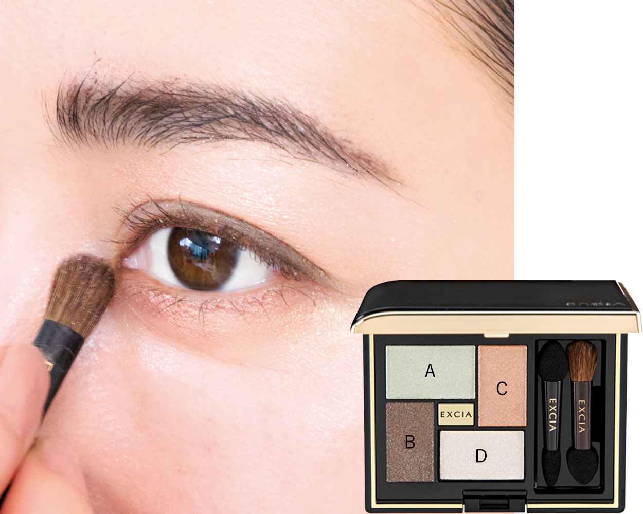 ❶Aのグリーンをチップに取り二重幅からアイホールに広げてぼかします。❷次にCのベージュをチップに取り、最初に入れたグリーンの境目のアイホールからまぶた全体に広げ馴染ませます。❸さらに、下まぶたの目尻から1/3程度にも入れ、涙袋に広げます。パステルグリーンもベージュと馴染ませることで、さりげなく骨格が際立ち立体的に見えます。❹次にBのグレーを細チップに取り、目の際にシャドウラインのように細く入れます。❺最後に、Dのハイライトカラーをブラシに取り、目頭にちょんと置き、眉下にもさっと入れぼかします。エクシア アイカラー ヴォロンテ 04 プリュム ドゥース ¥6,600(アルビオン)