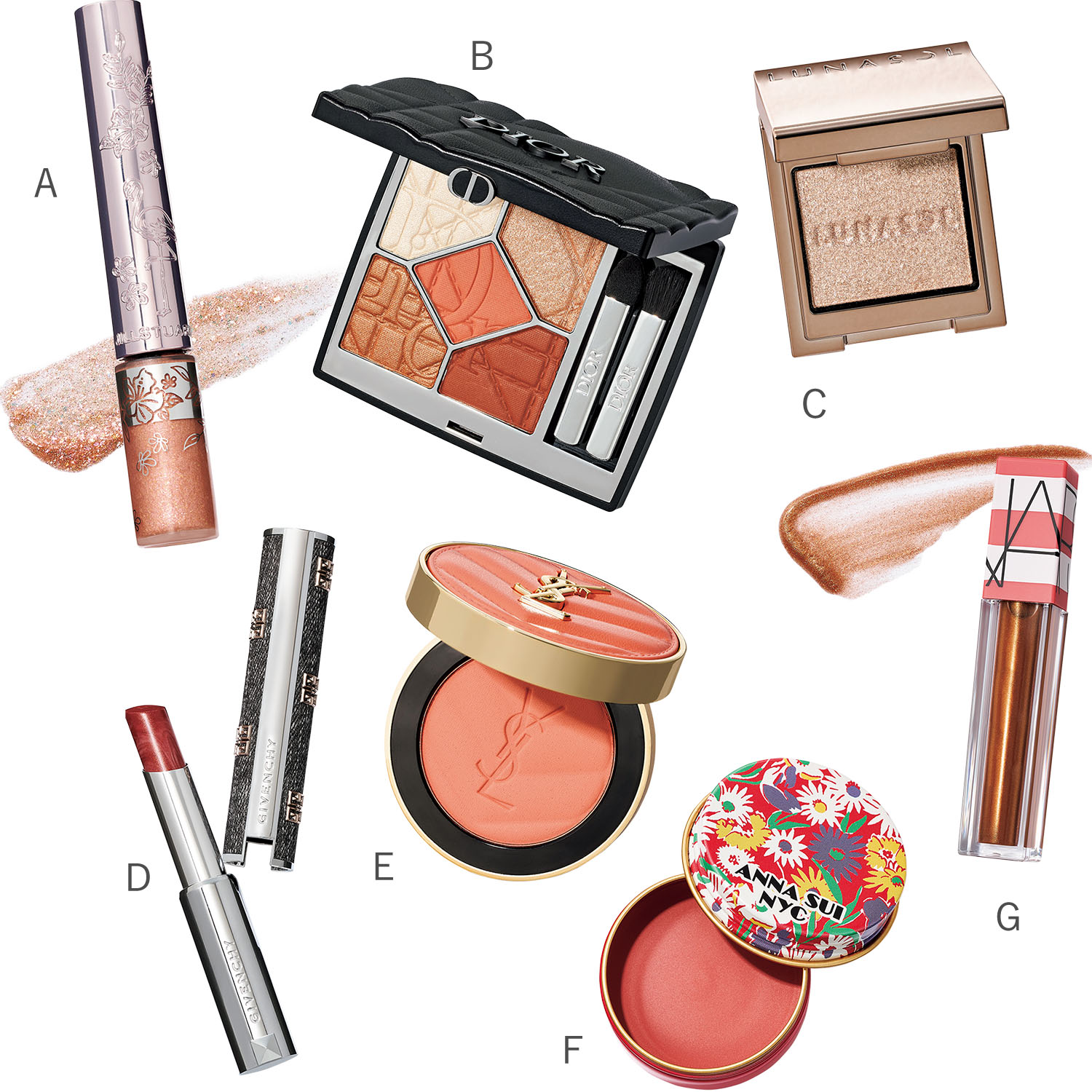 A:高輝度の大粒ラメとパールがひと塗りでまぶたに密着。ジルスチュアート アイダイヤモンド グリマー スパークル ピンクラグーン 14 ¥2,750(ジルスチュアート ビューティ)B:やわらかく温かみのあるコーラルトーン。ほのかに輝きを放ち印象的な目元に。ディオールショウ サンク クルール 671 ¥10,010(パルファン・クリスチャン・ディオール)C:月光のような透明度の高いパールが上品に輝く。しっとりとした使用感。ルナソル モノアイカラーレーション EX08 ¥3,520 ※7/4発売(カネボウ化粧品)D:繊細なグリッターがきらめく、ブロンズに輝くレッドブラウンリップ。ローズ・パーフェクト 517 ¥4,950 ※7/25発売(パルファム ジバンシイ)E:太陽を浴びたような印象の、ヘルシーなコーラルチーク。YSL メイクミーブラッシュ パウダー 57 ¥8,360(イヴ・サンローラン・ボーテ)F:目元、チーク、リップにマルチに使える、なめらかな透け感オレンジバーム。アナ スイ フェイス マルチ バーム 600 ¥2,420(アナ スイ コスメティックス)G:グロウなツヤ感と潤いをプラスする、大人のブロンズカラーリップ。NARS アフターグロー リップオイル 231A ¥4,180(NARS JAPAN)※すべて限定品