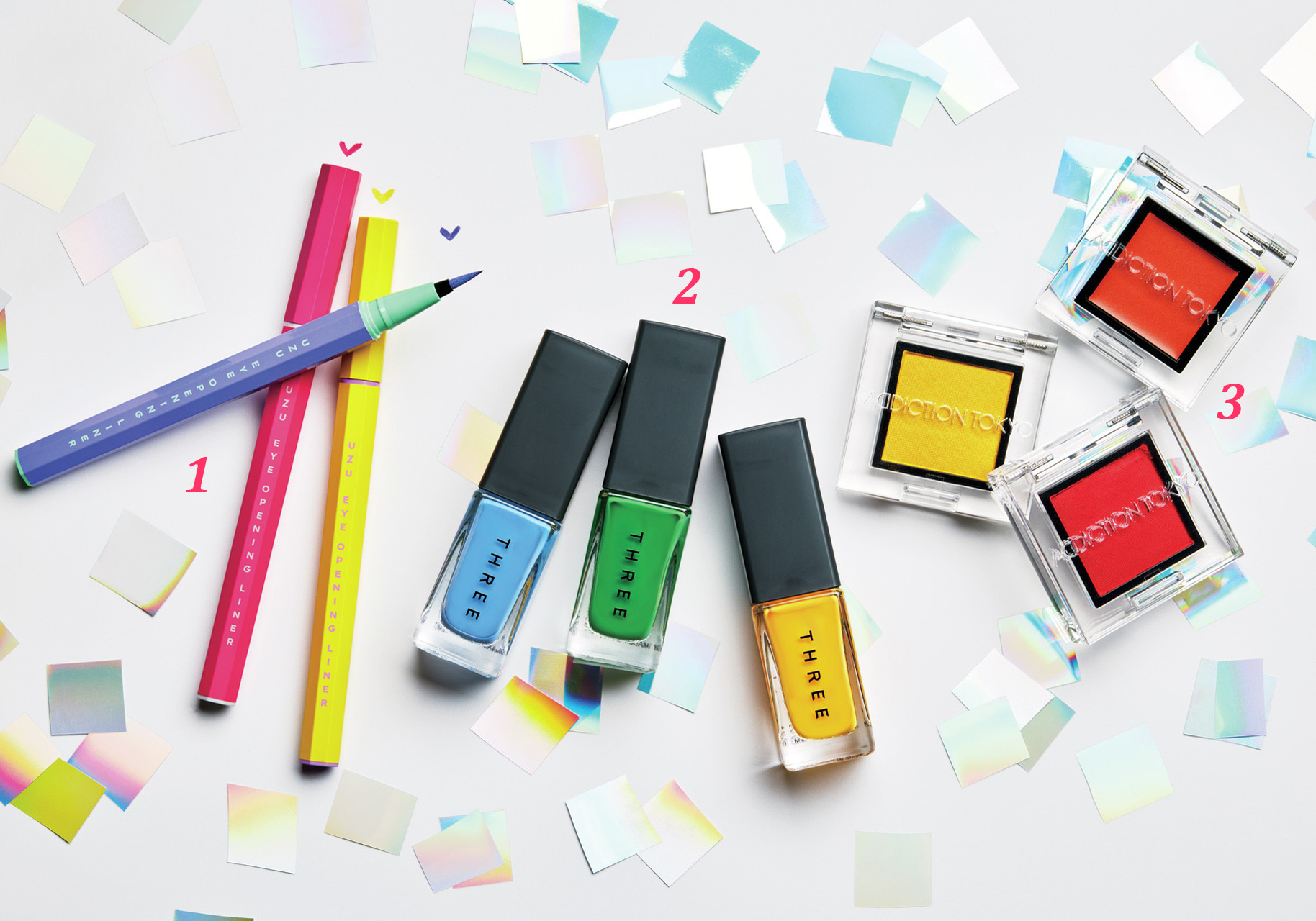 1. 【UZU】アイオープニングライナー(全15色・うち限定5色)左から、PASTEL PURPLE(数量限定)、BURGUNDY、YELLOW(数量限定)各¥1,694(UZU)2. 【THREE】ネイルラッカー(全20色) 左から、13、03、01 各¥2,420(THREE)3. 【ADDICTION】ザ アイシャドウ マット(全29色)左から、022M、024M 各¥2,200、右上 同クリーム(全14色)002C 各¥2,200(アディクション ビューティ)