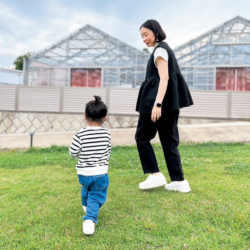 朝の送りから夕方のお迎えまで、お直しゼロで透明感キープ
