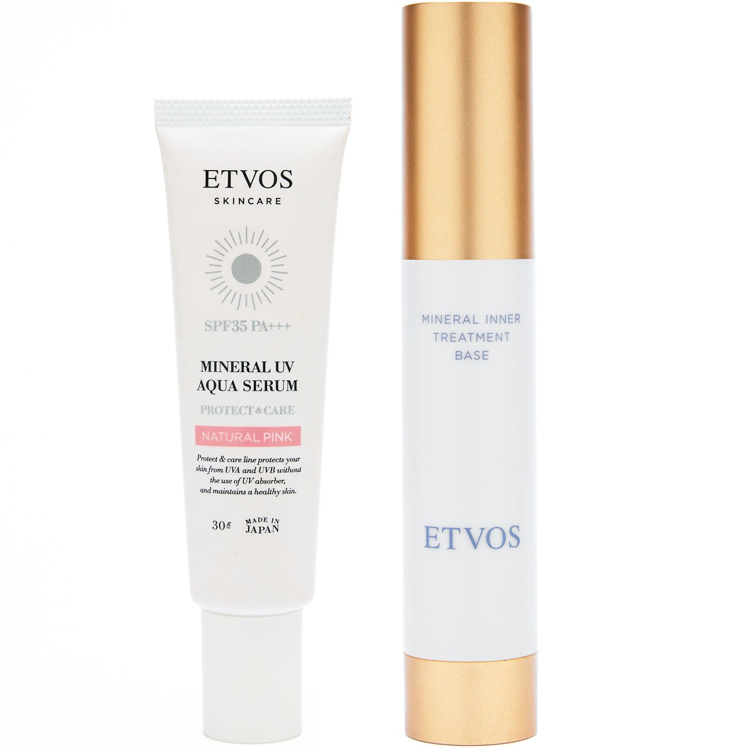 洗顔料で簡単に落とせるエトヴォスが子育て中にぴっ たりで集め中!左のUVアクアセラムはピンクで血色感をプラス。右のトリートメントベースはラベンダー系で赤みを補整します。