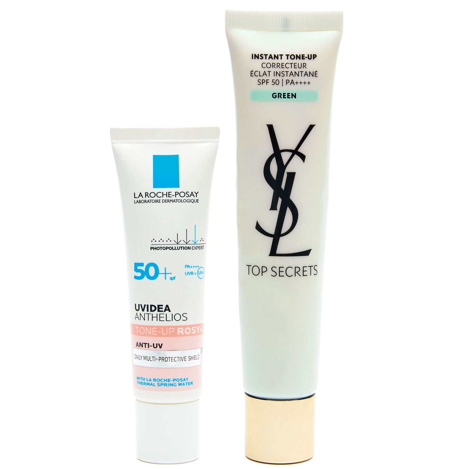 ラ ロッシュ ポゼの新作下地でツヤを。イヴ・サンローランのグリーン下地はくすみやすい目の下や、ハイライトを入れる額やあごに重ねて。くすみが飛び、UV効果もばっちり。