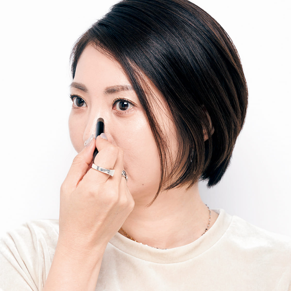 鼻筋、フェイスラインにシェーディングを入れるのも忘れずに。顔に立体感が生まれて小顔効果も。カネボウのシャドウオンフェース01はスティックタイプで使いやすく優秀!何度もリピートしています。