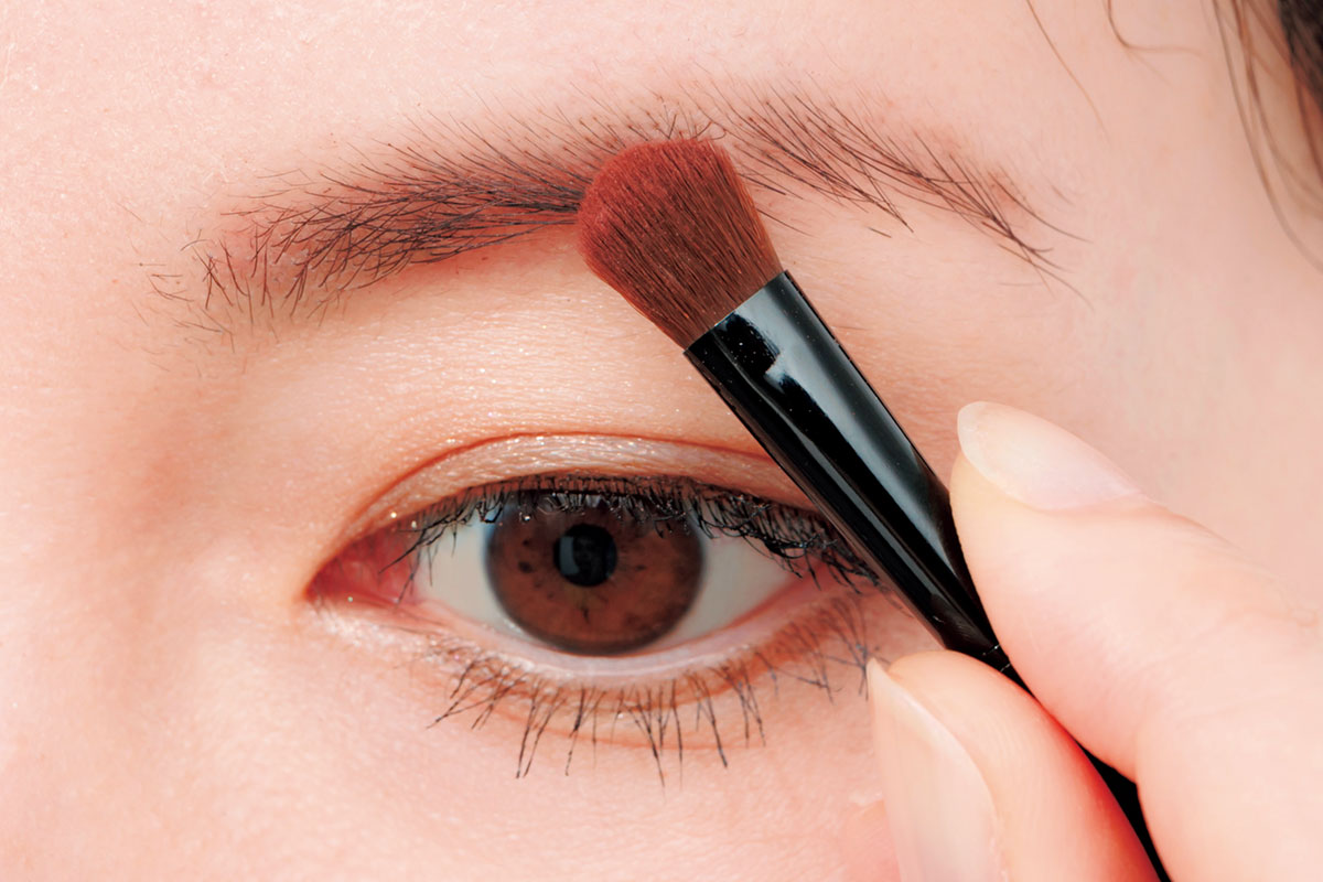 ブラシを縦にして眉尻から毛流れに逆らって全体に。その後、ブラシを横にして眉頭から毛流れに沿って塗っていく。