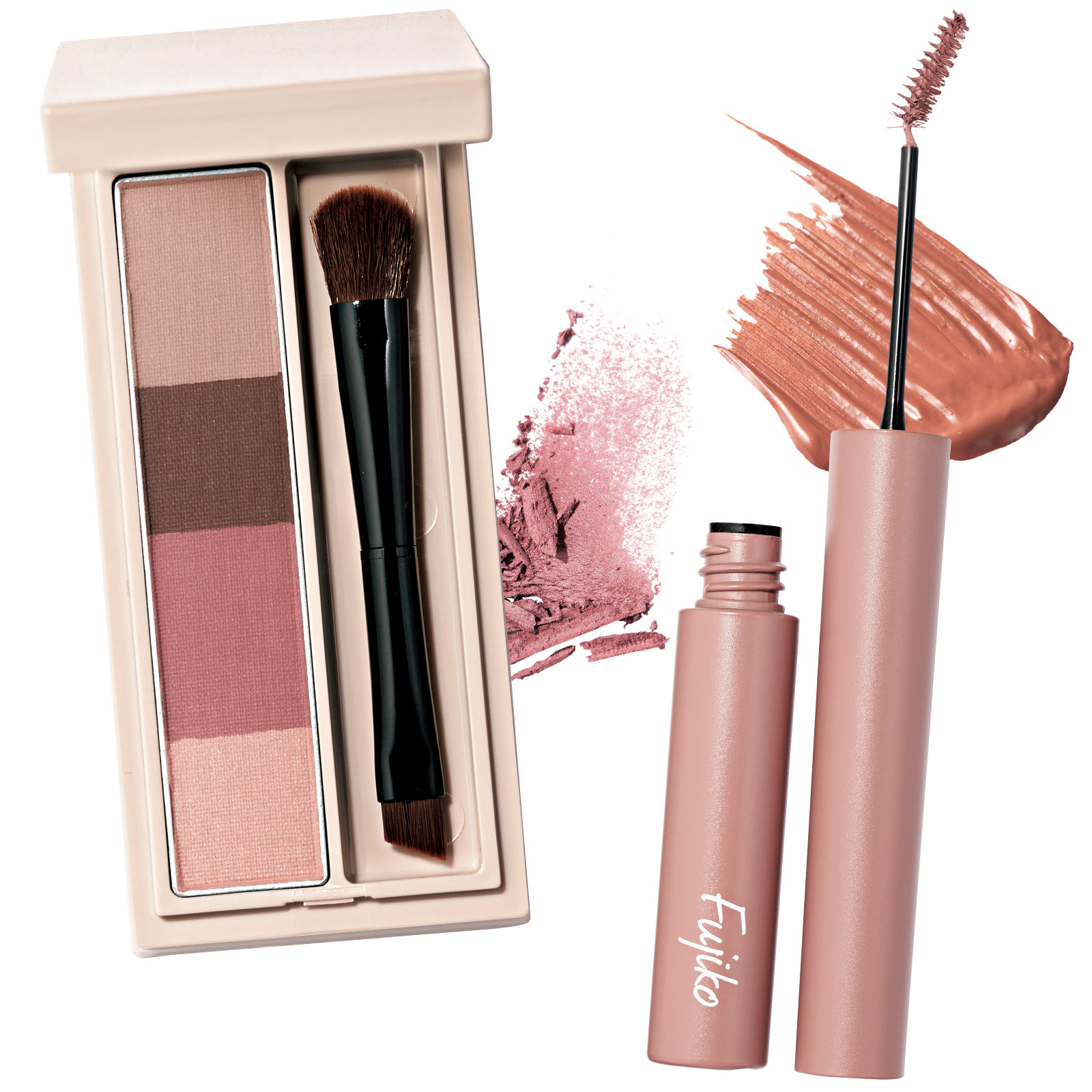 右:大人がチャレンジしやすい、絶妙な茶系のピンクカラーが◎。【モデル使用】:肌にベタッとつきづらく、塗りやすい形状。フジコ マジカルアイブロウカラー 04 ¥1,408(かならぼ)