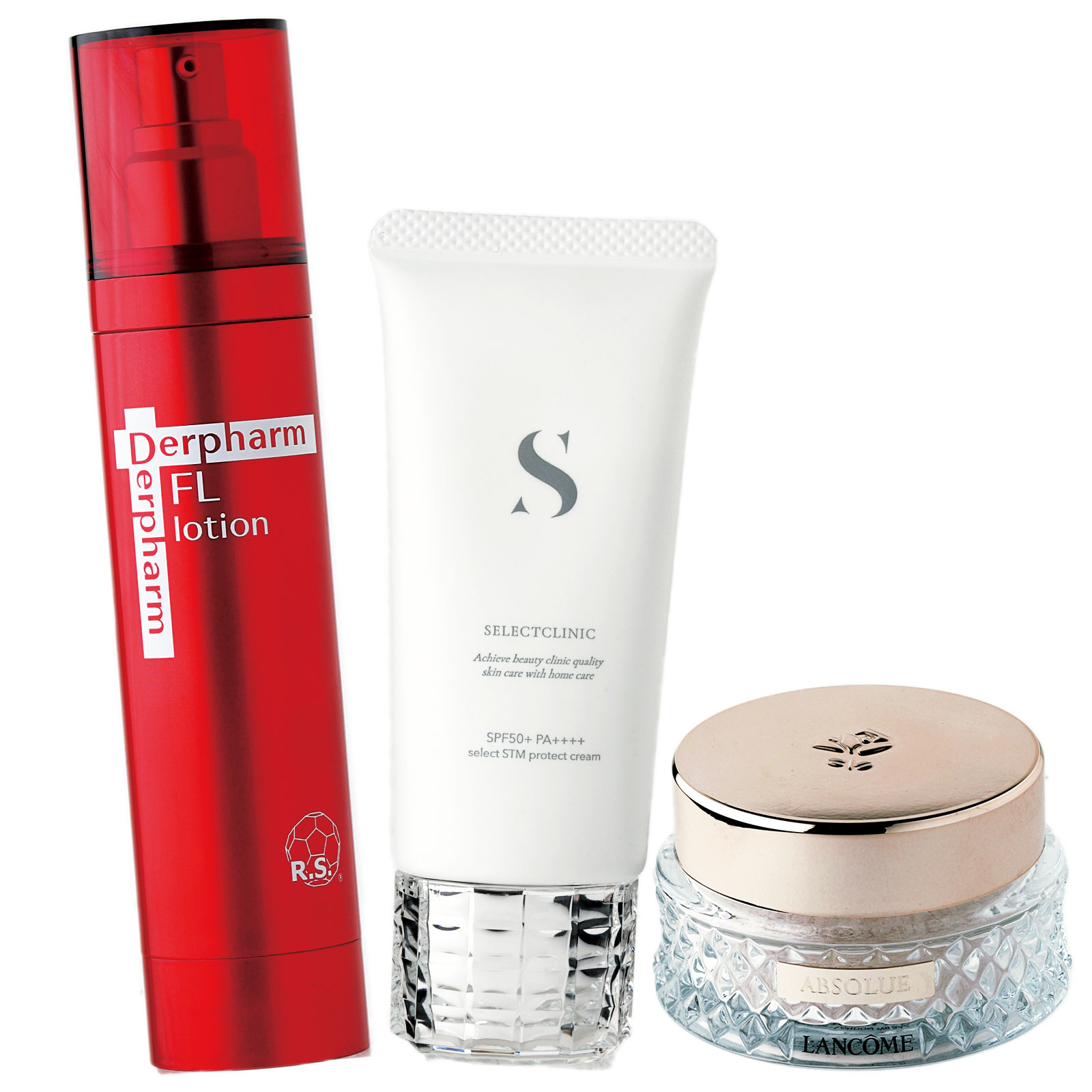 〈左から〉デルファーマ FLローションは水溶性フラーレンとレチノール配合ジェル状化粧水。セレクトSTMプロテクトクリームはテクスチャーや香りに至るまで、1年以上かけて作った自信作。ナイアシンアミド配合美容液UVとして大人気に。ランコム アプソリュ エッセンス イン パウダーはラメ入りの粉が細かく毛穴と小ジワをカバーしてくれるので感動。ひんやり感は夏にも◎。