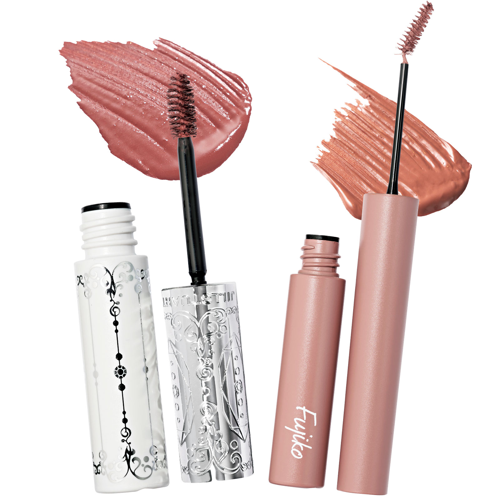 大人がチャレンジしやすい、絶妙な茶系のピンクカラーが◎。左:ふんわりセミマットな質感に仕上げられて、お湯オフできるのが嬉しい。ジルスチュアート ムースブロウマスカラ 08 ¥2,420(ジルスチュアート ビューティ)右:肌にベタッとつきづらく、塗りやすい形状。フジコ マジカルアイブロウカラー 04 ¥1,408(かならぼ)
