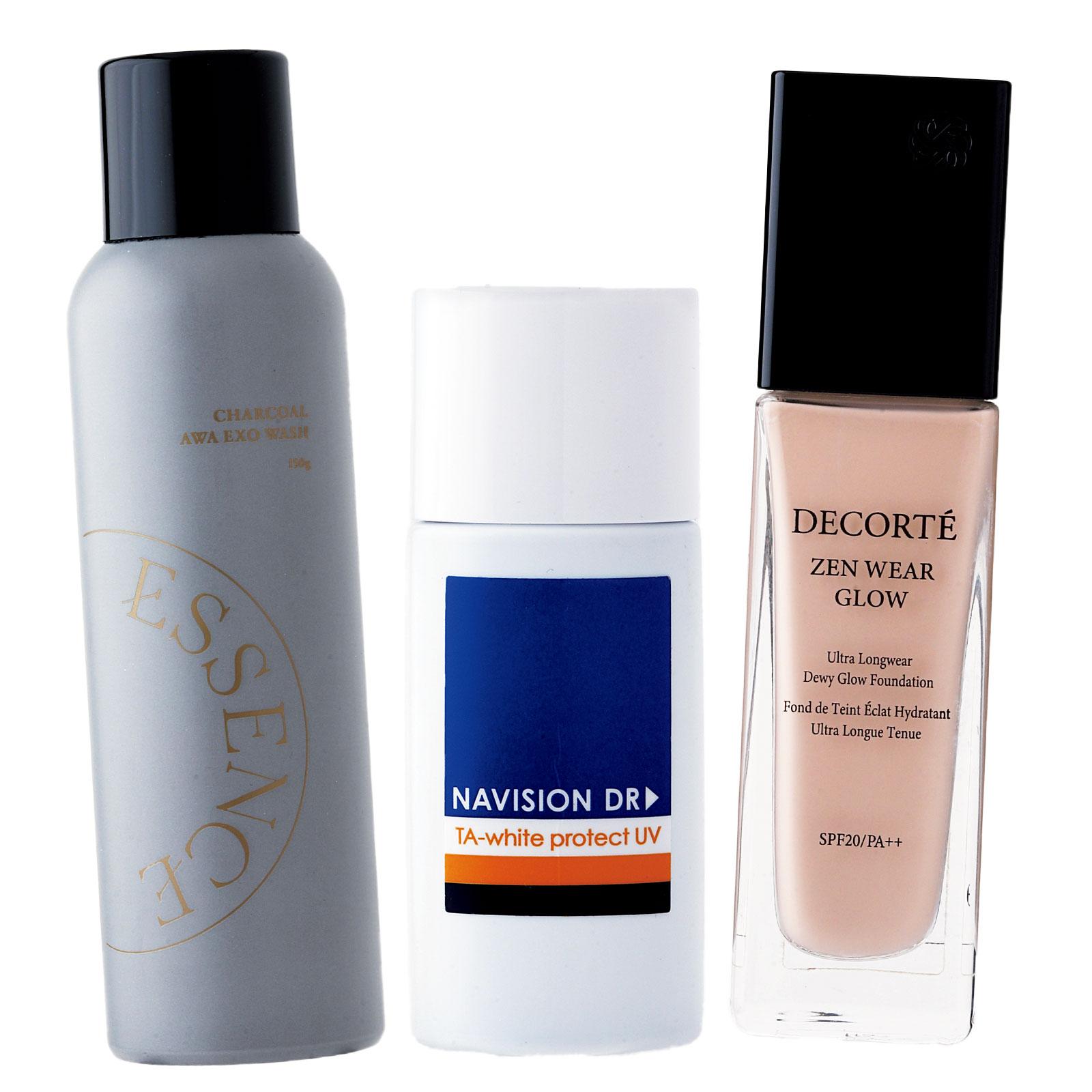 〈左から〉エステプロ・ラボ チャコール アワ EXO ウォッシュ、ナビジョンDR TAホワイトプロテクトUV、コスメデコルテ ゼン ウェア グロウ。興味があるものはすべて試してみたくなります。一度気に入ると長く使用します。施術後にできた内出血や隠したい部位には、M・A・Cのコンシーラーがベストなのでリピート中です。