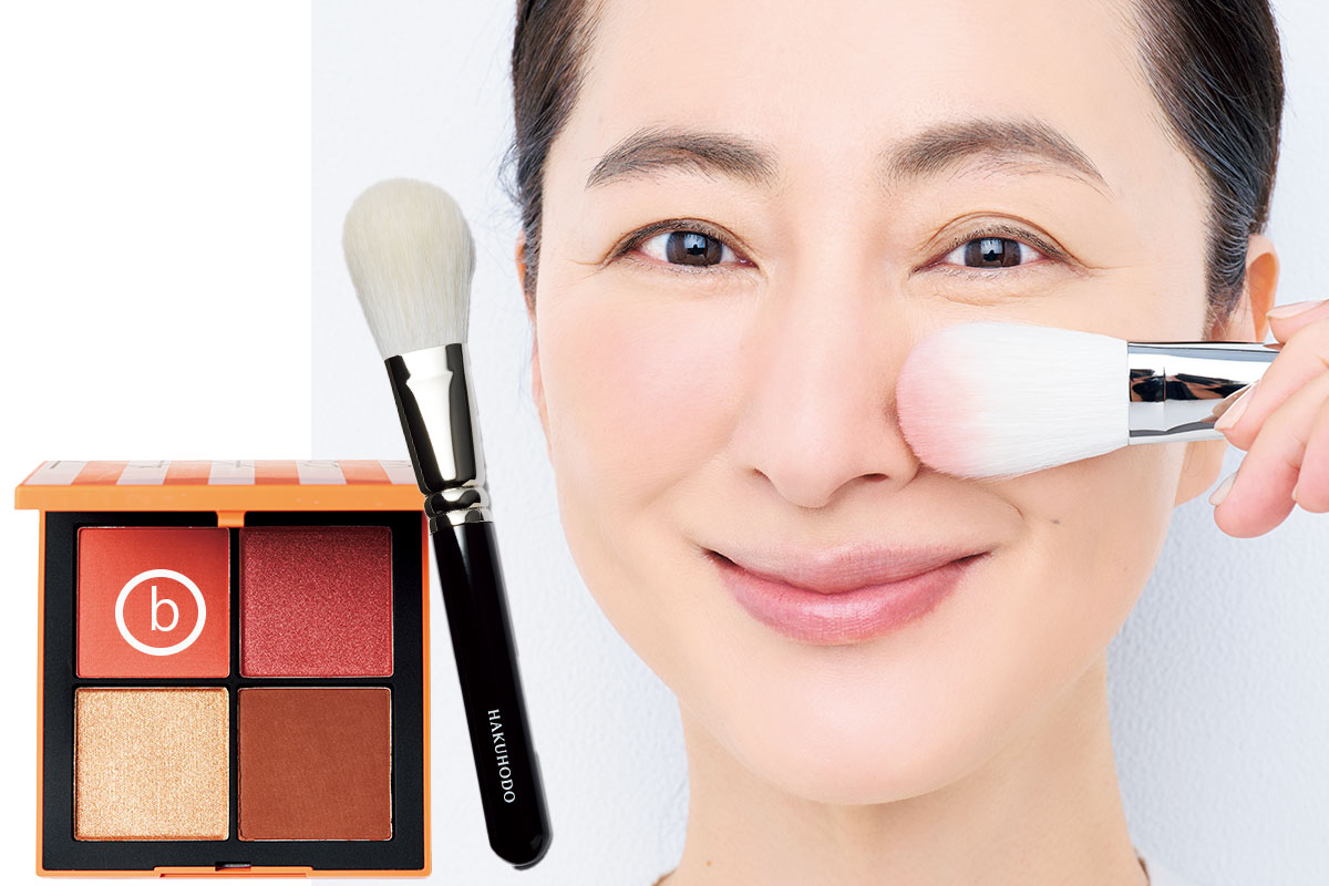 夏の元気顔とは、メイク崩れせず一日中フレッシュな肌がキマっていること。夏はスキンケアから崩れにくさを意識したいので、化粧水の後は、美容液かさっぱりめのクリームで仕上げて。肌作りは塗り重ねる工程が増えると崩れやすくなるので、1本でUV+トーンアップする色付き下地を。世代的にノーファンデはハードルが高いと思うので、リキッドファンデで肌に薄いヴェールをかけツヤ感を。工程が少ない分、スポンジや筆などツール選びに拘って、夏の肌トラブルの赤み、毛穴の開きなどを丁寧にカバーしていきましょう。