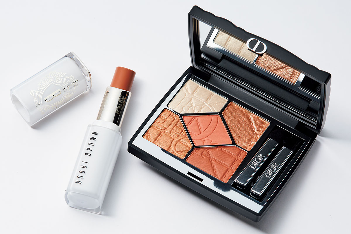左/ヌーディカラーならオーバーリップに挑戦しやすい。エクストラ カラーシャイン ヌードハニー ¥5,060(ボビイ ブラウン)、右/ディオールショウ サンク クルール コーラルカラーがリッチな目もとに。671(数量限定品)¥10,010(パルファン・クリスチャン・ディオール)