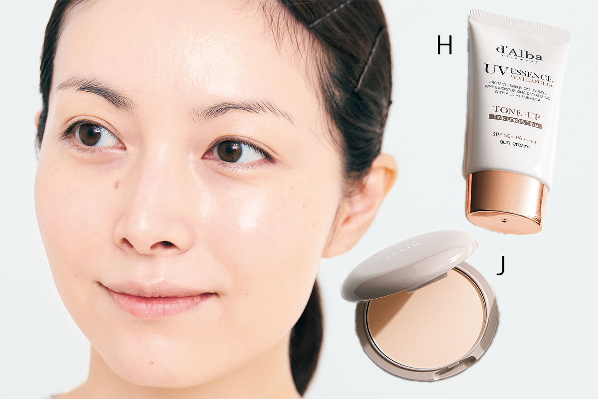 Hの下地を指で中心から外に伸ばし立体感を。さらにIのファンデーションをのせ、手の甲に余ったファンデをスポンジにとり優しくパッティング。Jのパウダーは筆でさらりとなでるようにオン。仕上げに手の平で顔全体をプッシュ。