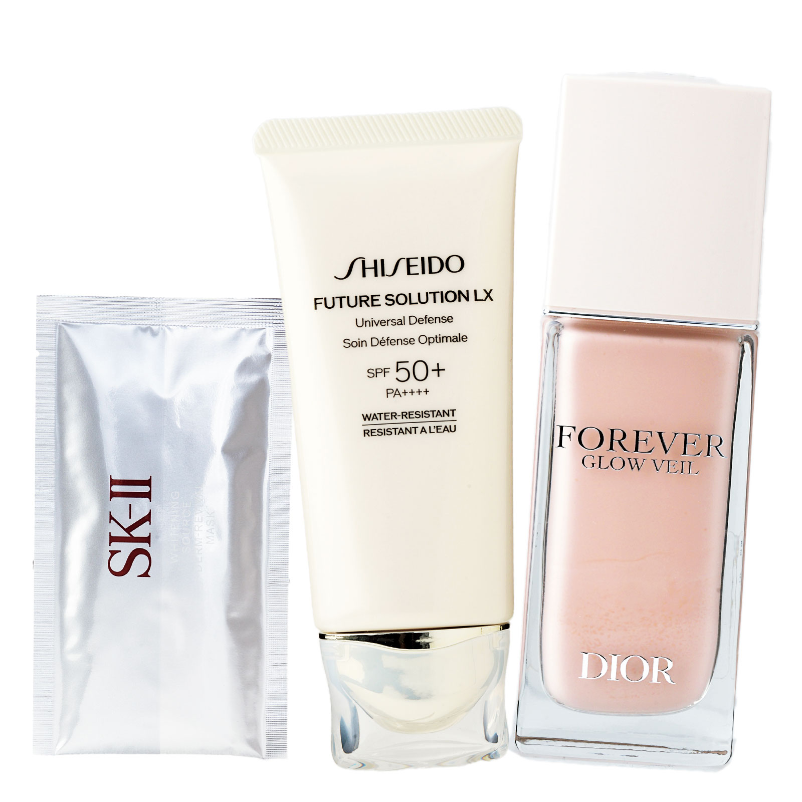 〈左から〉SK-ⅠⅠ ホワイトニング ソース ダーム・リバイバルマスクは予定のある前日には必ず使用したくなります。SHISEIDOフューチャーソリューション LX ユニバーサル ディフェンスsは安定の使用感。日焼け止めは一年中しっかりと。ディオール スキン フォーエヴァー グロウ ヴェールは薄く伸ばして。ファンデは女性のマナー。ストッキングと同じです。