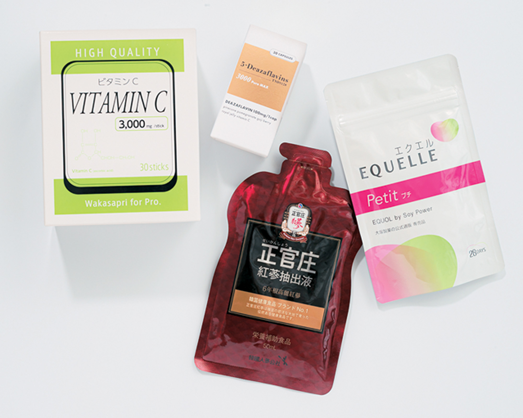 【Health】酸化に傾く夏はサプリ補給で細胞レベルから活性。右からエクオール、正官庄6年根紅参エキス、デアザフラビン、ワカサプリのVC3000。