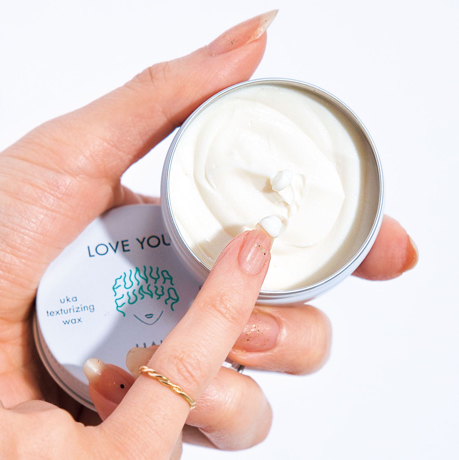 日中に油分のないマットなワックスで髪をお直し。量は小指の先端くらいで。LOVE YOUR FUNYAFUNYA HAIR texturizing wax for flat & fine hair ¥2,640/uka