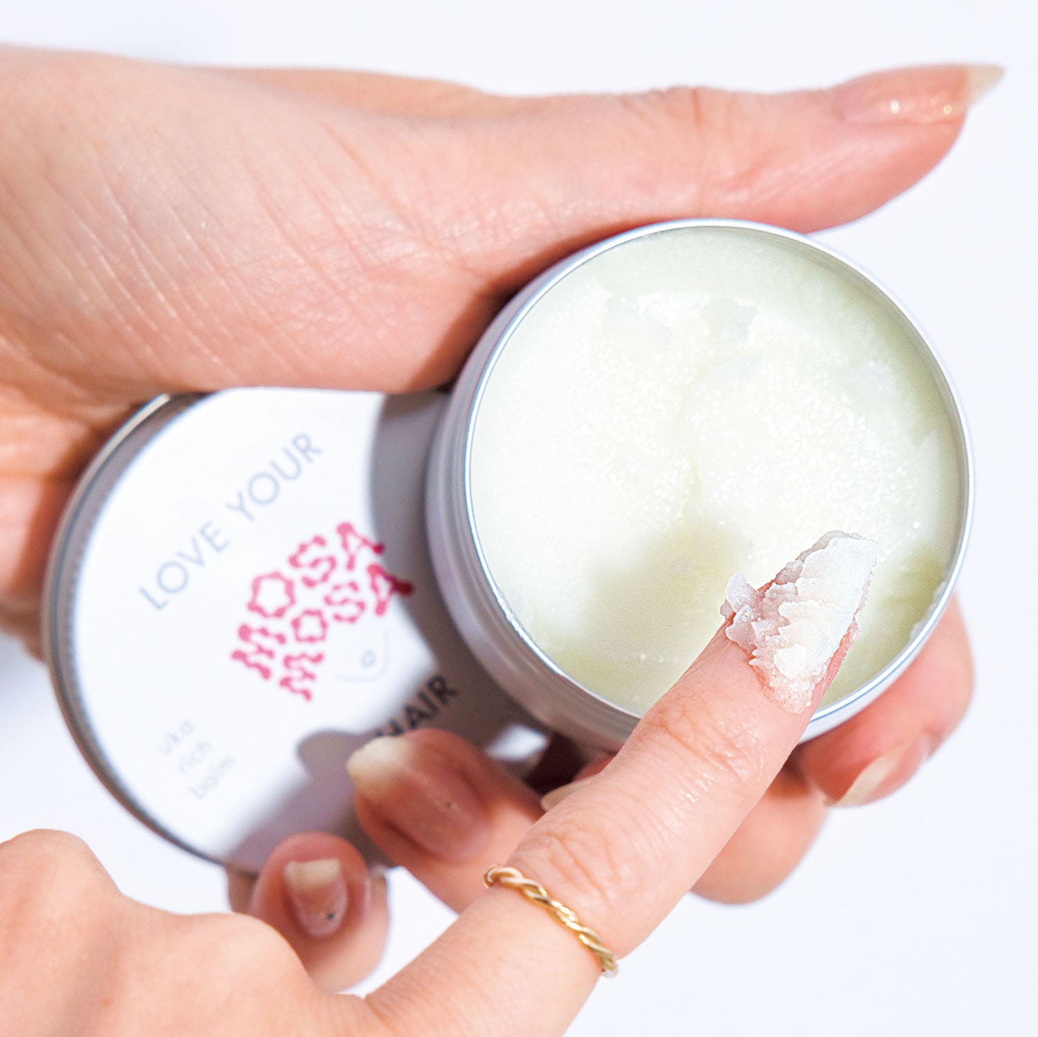 バームを前髪以外の髪の根元から中間にかけて塗布。根元が立ち上がるようにまとめると若々しい印象になります。小指の先ほどのバームをしっかり髪になじませると艶やかに。LOVE YOUR MOSAMOSA HAIR rich balm for coarse hair ¥2,640/uka