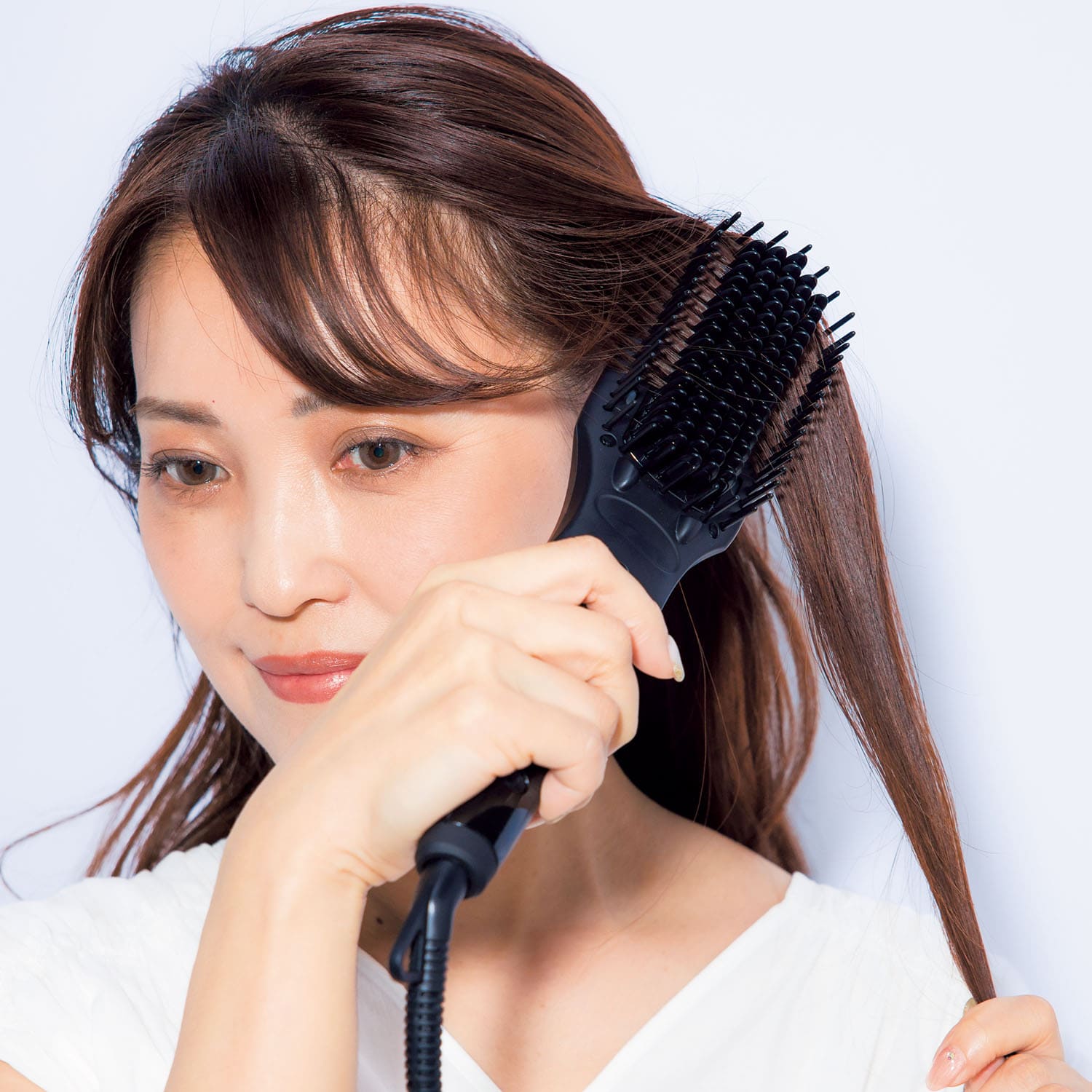 こめかみからもみあげにかけての髪をヒートブラシでワンカール。ここだけでも手をかけるとクリーンな印象に。アイロンもいいけれどヒートブラシがテクいらずでおすすめ。¥3,000ほどでコスパも◎。