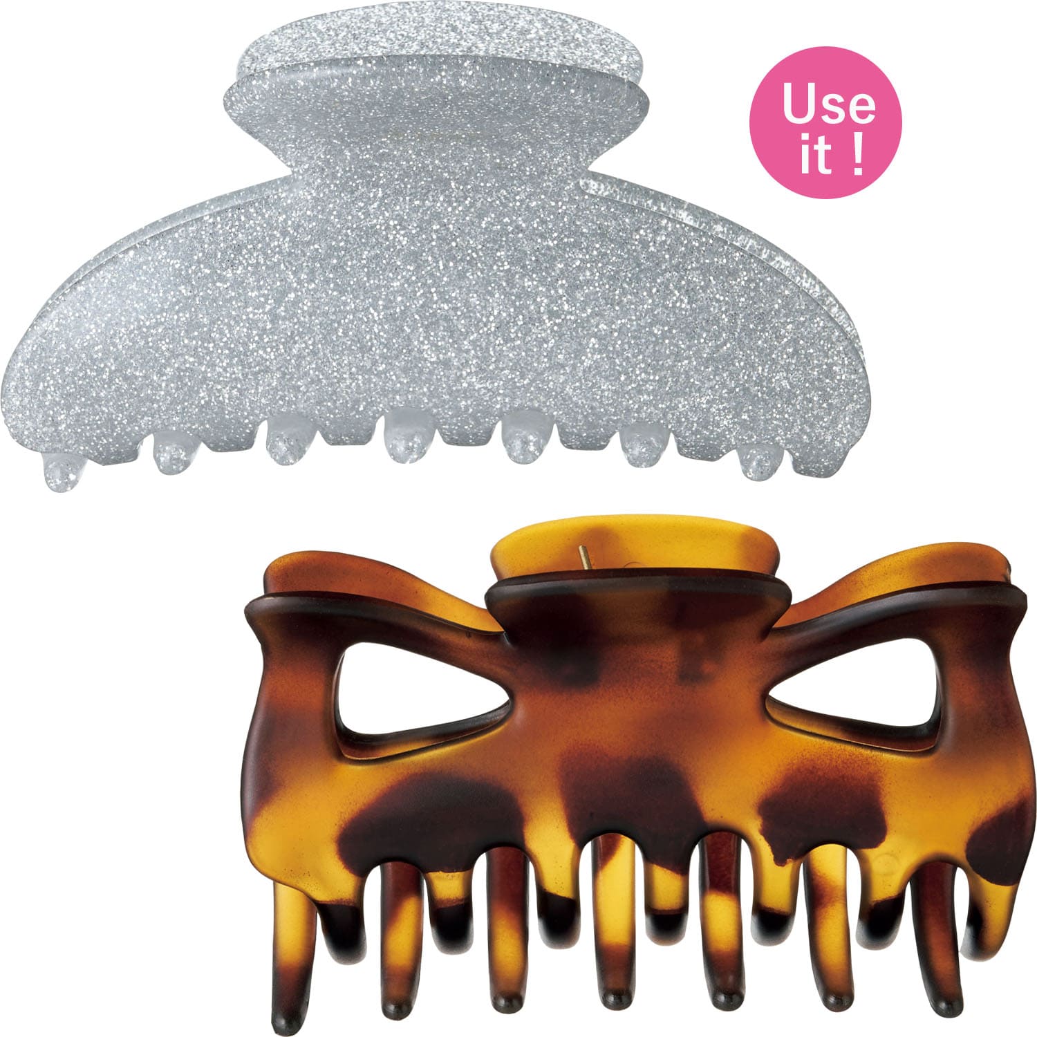 クリップの重さで髪が落ちないよう軽量タイプ。上下のヘアのふんわり感を足せる横幅が短いデザインがオススメ。上:[モデル着用]シルバーラメクリップ ¥1,650(アネモネ/サンポークリエイト)下:クリップ ¥550(OSEWAYA/お世話や)