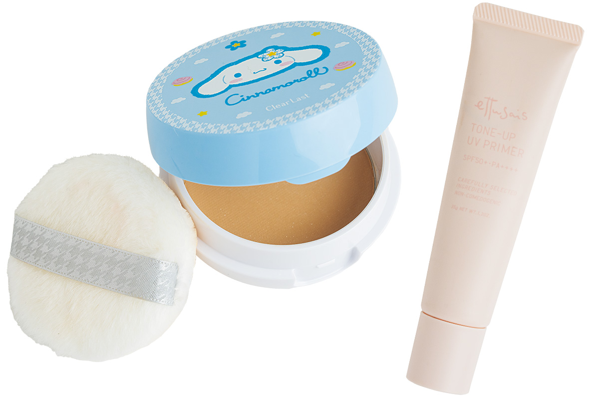 スキンケアとファンデ以外はプチプラで揃えます。右のエテュセのトーンアップUVプライマーはSPF50+で薄づきでつけ心地なめらか。左はシナモロールのパケにテンションアップするクリアラスト フェイスパウダーのキラ肌オークル。セミマットで日中の開き毛穴も隠れます。