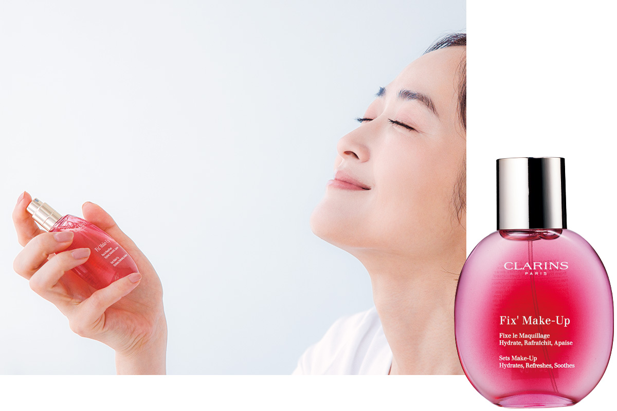 〈使用アイテム〉ファンデの毛穴落ちやメイクの色移りを防ぎ仕上がりの美しさを保つ。フィックス メイクアップ N 50ml ¥5,060(クラランス)