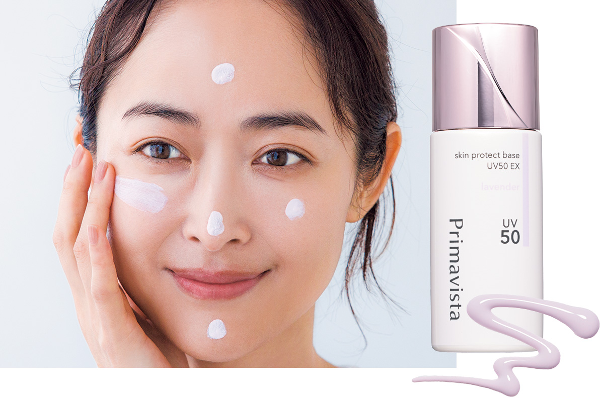 〈使用アイテム〉毛穴&崩れをカバー。プリマヴィスタ スキンプロテクトベース 皮脂くずれ防止 UV50 EX ラベンダー SPF50・PA+++ UV耐水性★ ¥3,080〈編集部調べ〉(花王)