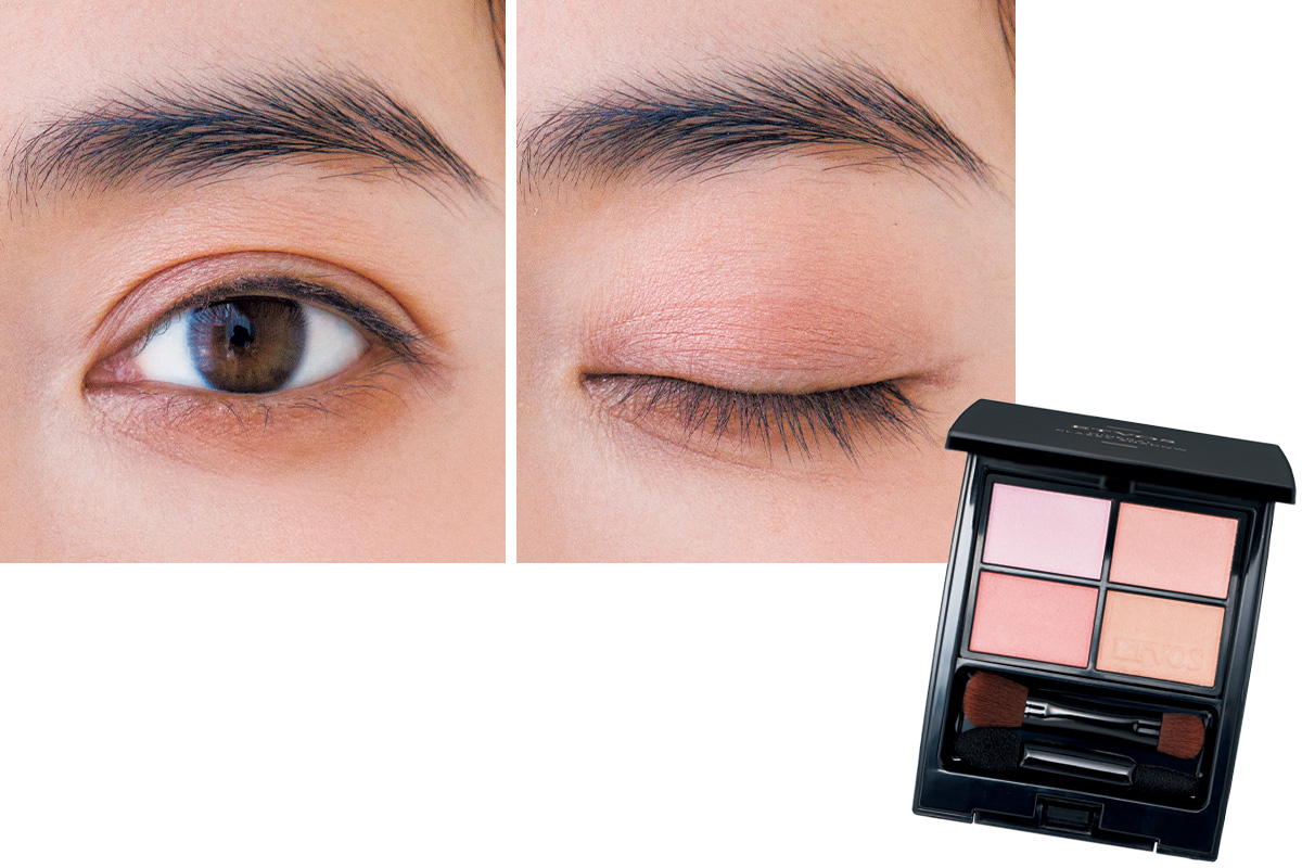 右上と左下の色をブレンドし、上まぶたのキワから左右に動かして眉下まで広げる。下まぶたには右下の色を塗布して、中顔面短縮効果を狙って。
