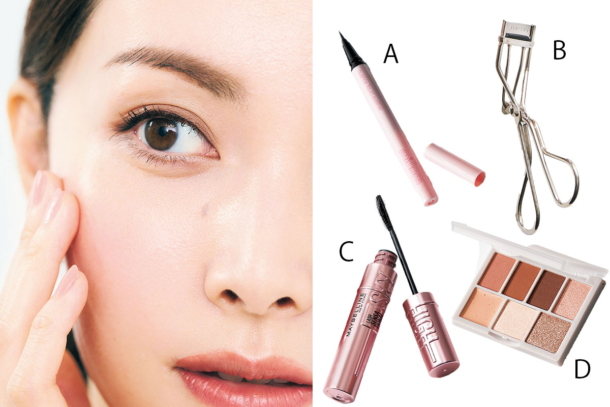 Aのアイラインを細めに。にじまないコスメ選びも重要。まつ毛はBのミニビューラーで複数回に分けてまつ毛を上げ、Cのマスカラで仕上げます。Dの左下のカラーでベースを、上の左側2色で瞼のキワに陰影を。